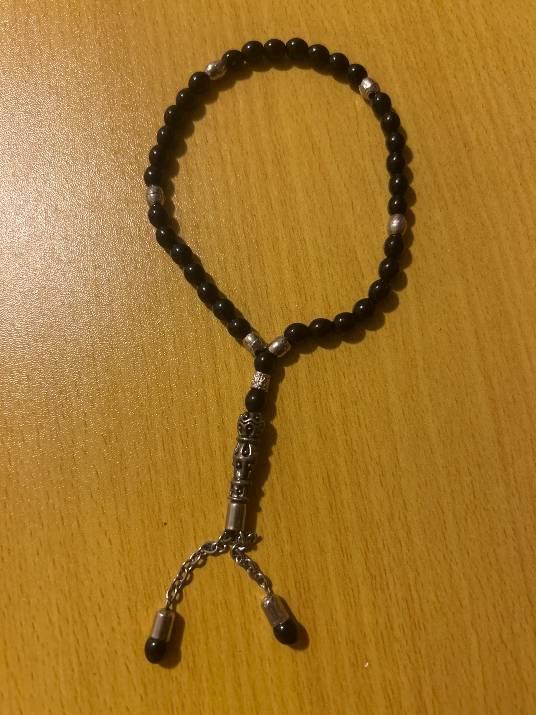 A string of black prayer beads, accented with silver-toned metal separators and a decorative tassel. These beads are suitable for prayer or as a decorative accessory. They're made with durable materials for regular use.