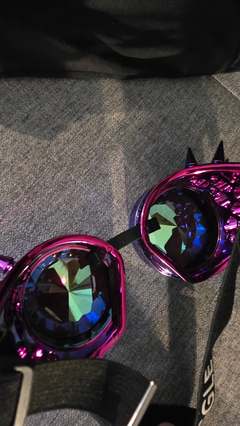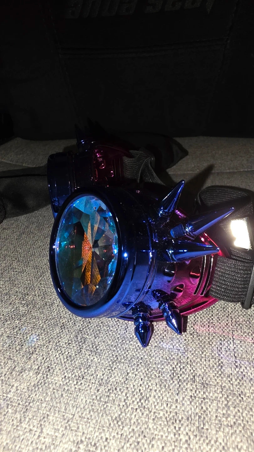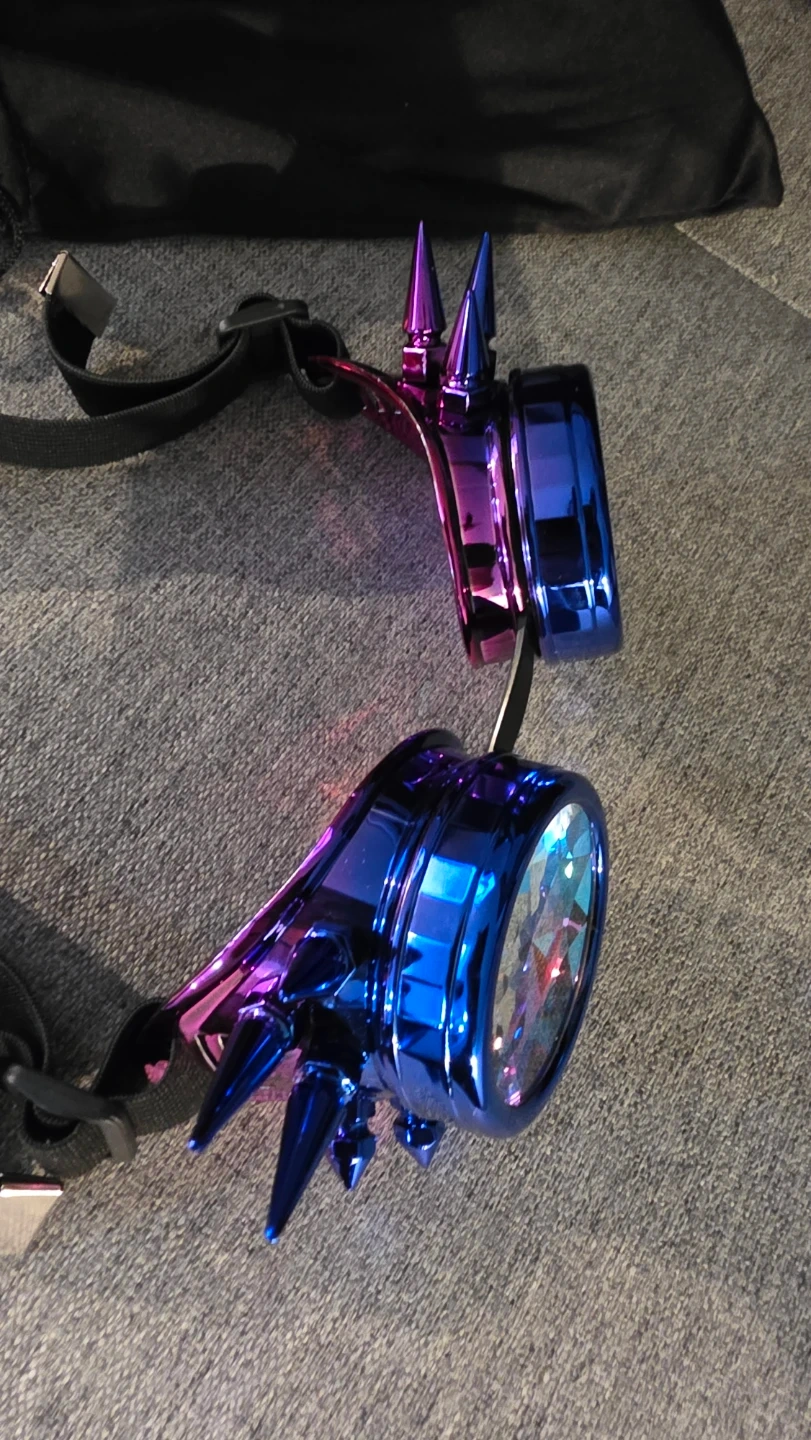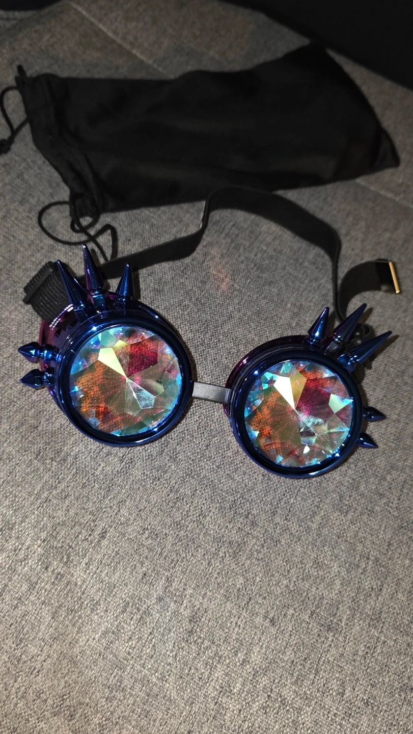 These kaleidoscope goggles feature a vibrant iridescent finish with silver spikes. They include a black drawstring pouch for storage. Perfect for festivals or adding flair to an outfit!