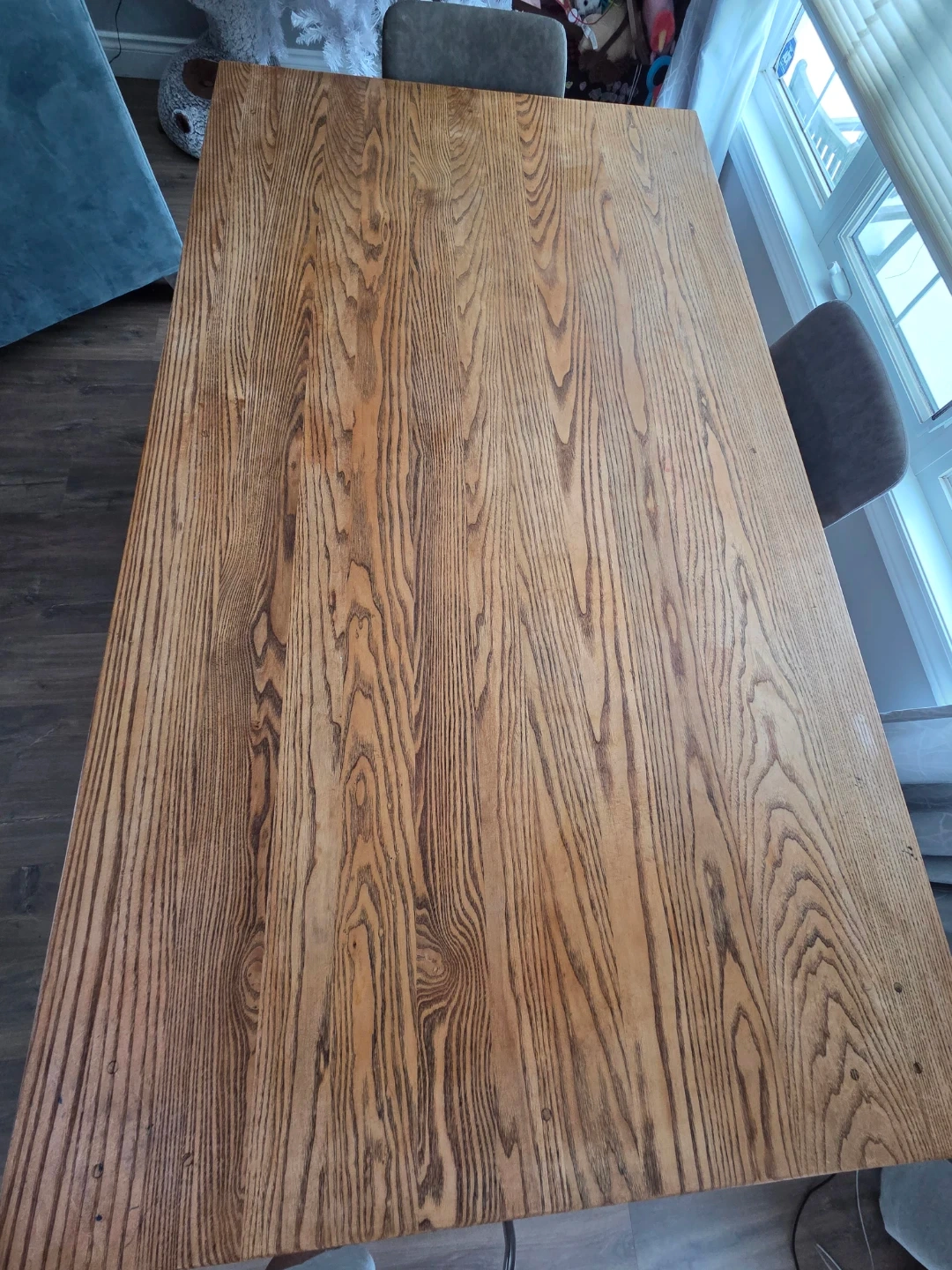 Rustic dining table and bench with a distressed white and wood finish. The tabletop has a beautiful natural wood grain. This set is perfect for a kitchen or dining area needing a touch of farmhouse charm.