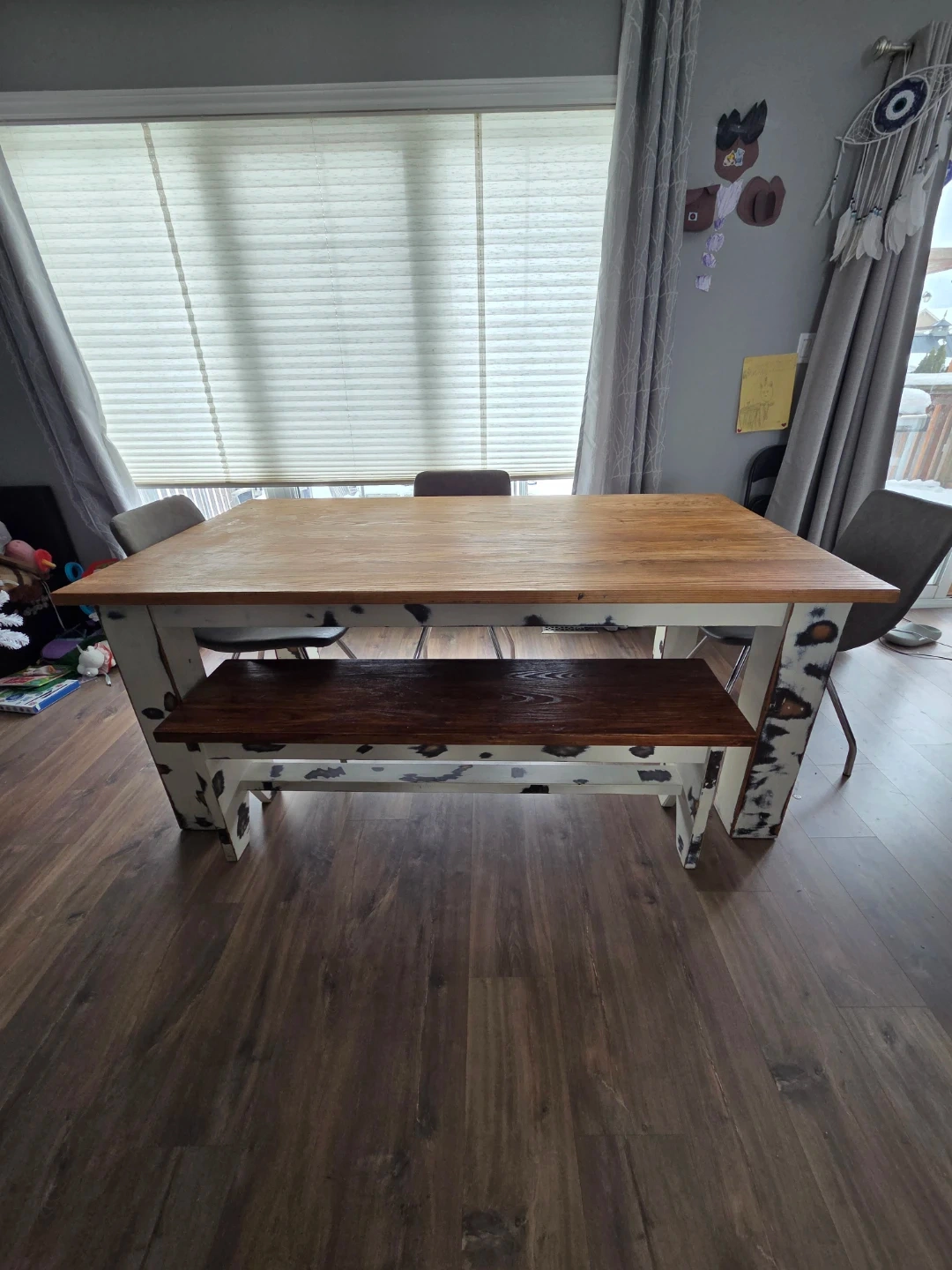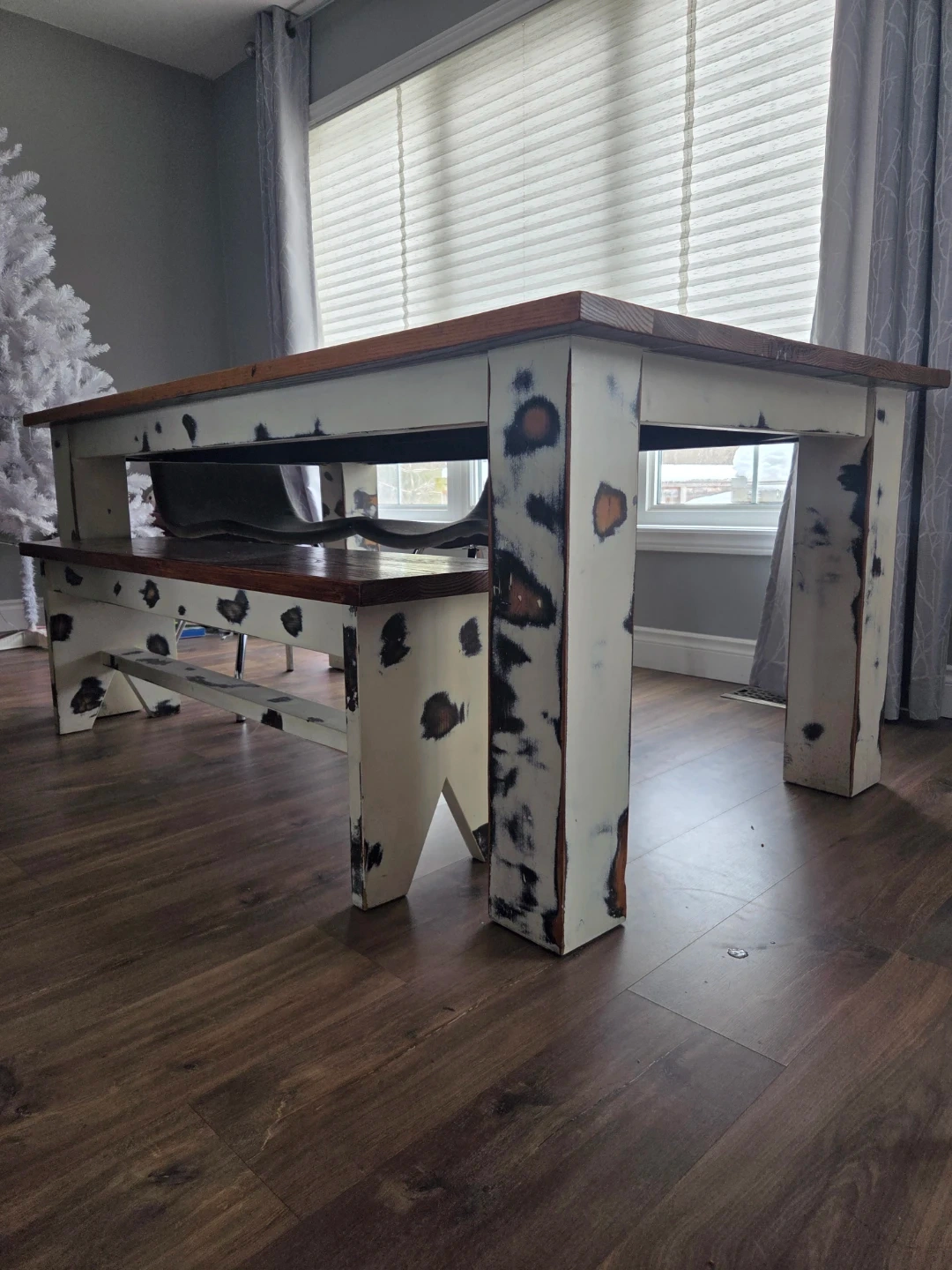 Rustic dining table and bench with a distressed white and wood finish. The tabletop has a beautiful natural wood grain. This set is perfect for a kitchen or dining area needing a touch of farmhouse charm.