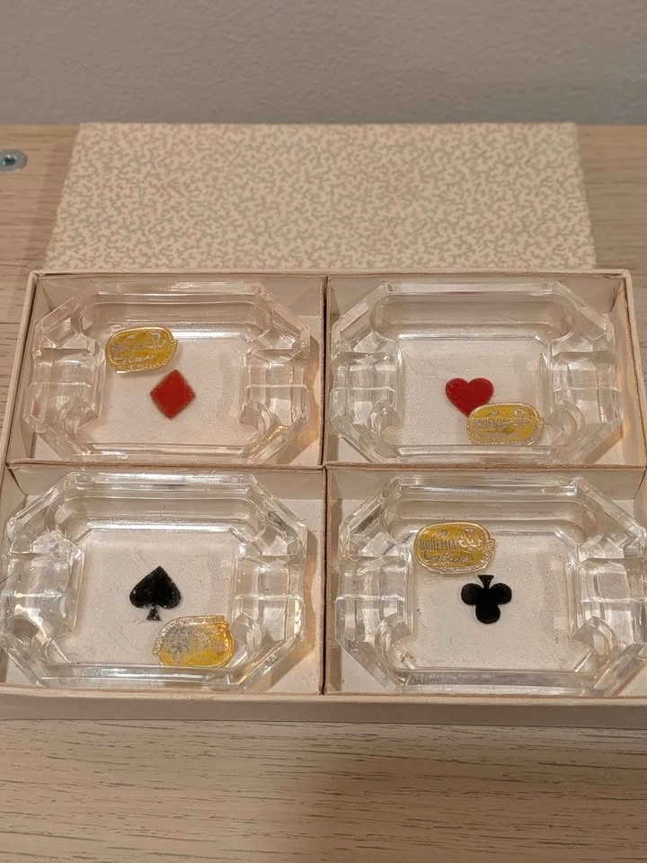 Set of 4 crystal ashtrays with playing card suits – heart, diamond, spade, club. Made in Czechoslovakia. Original box, original stickers. Perfect condition. Great for poker nights or as decorative trinket dishes. Pickup at Yonge and Lawrence, Toronto. Let me know if you're interested!