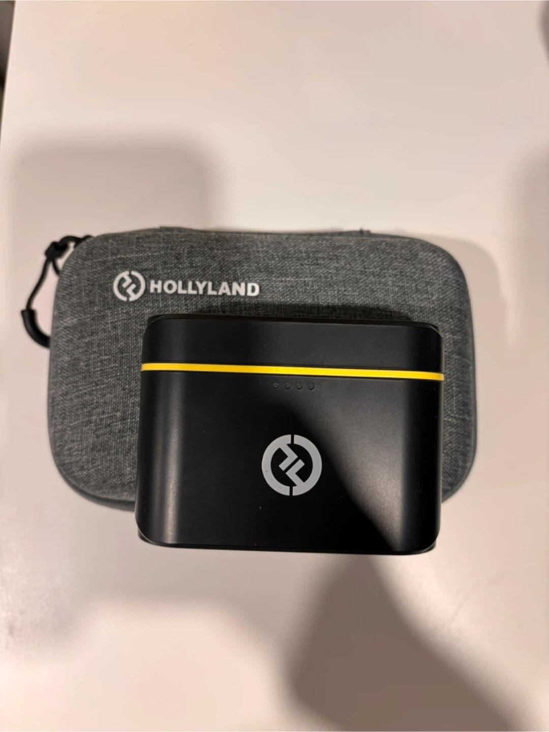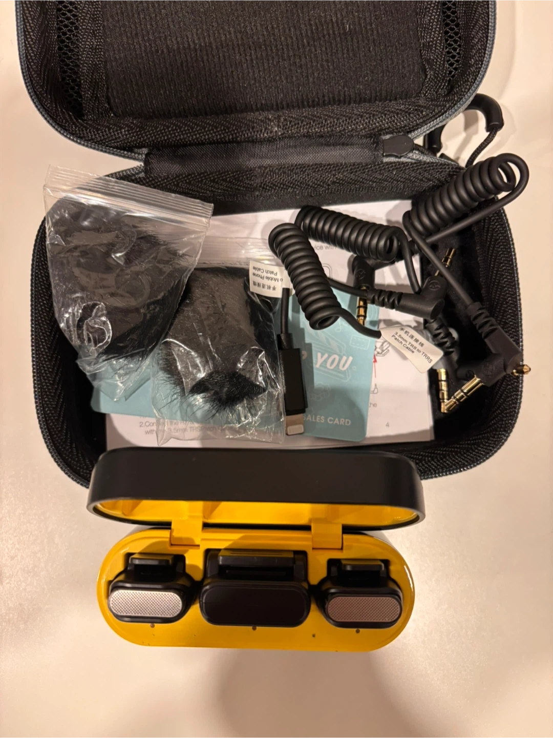 This is a Hollyland Lark M1 wireless lavalier microphone system. It includes two transmitters, a charging case, and a receiver. Also comes with various accessories like cables and windscreens. Great for recording clear audio on the go!