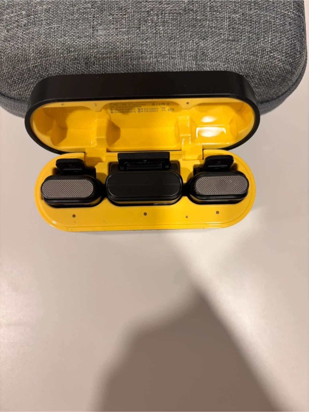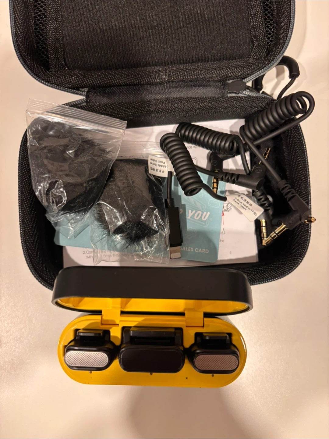 This is a Hollyland Lark M1 wireless lavalier microphone system. It includes two transmitters, a charging case, and a receiver. Also comes with various accessories like cables and windscreens. Great for recording clear audio on the go!