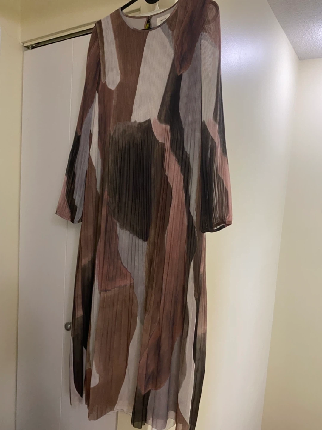 This is a Wilfred pleated midi dress. It features an abstract print with brown, pink tones. The dress has long sleeves and a flowy silhouette.