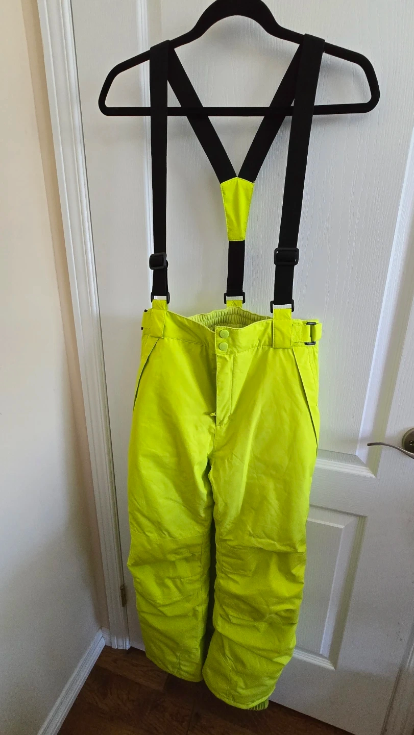 Mountain Warehouse ski pants in a bright yellow colour. Comes with adjustable suspenders and elasticated waistband.