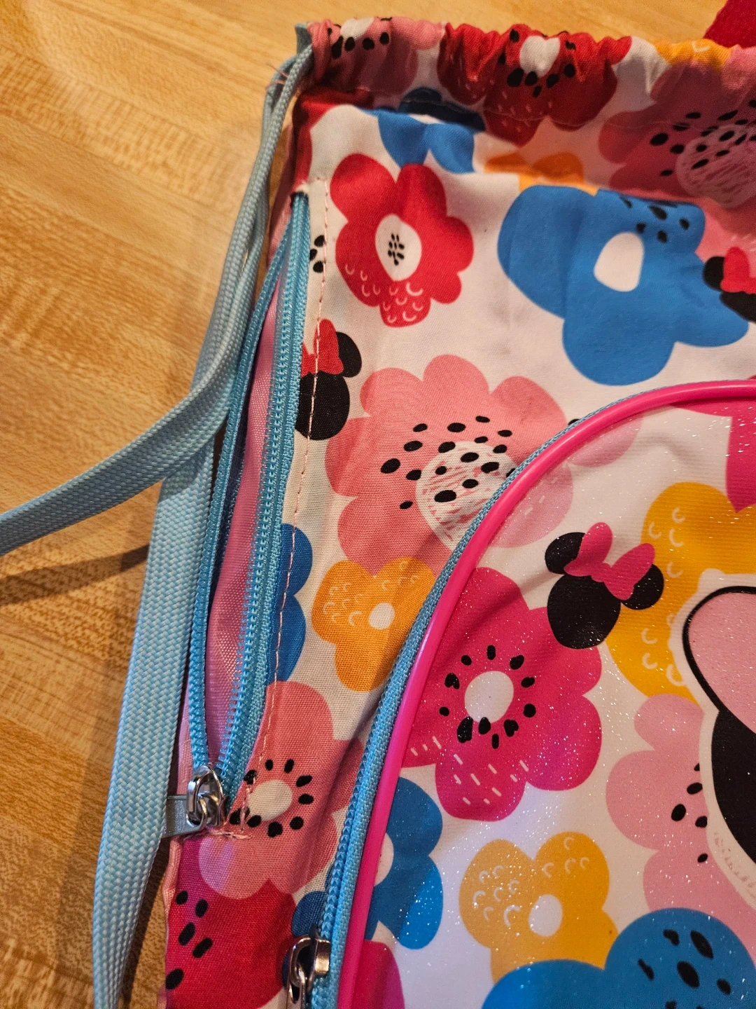 Cute pink drawstring backpack featuring Minnie Mouse and a floral pattern. It's made of polyester and has a zippered front pocket. Perfect for carrying essentials on the go!