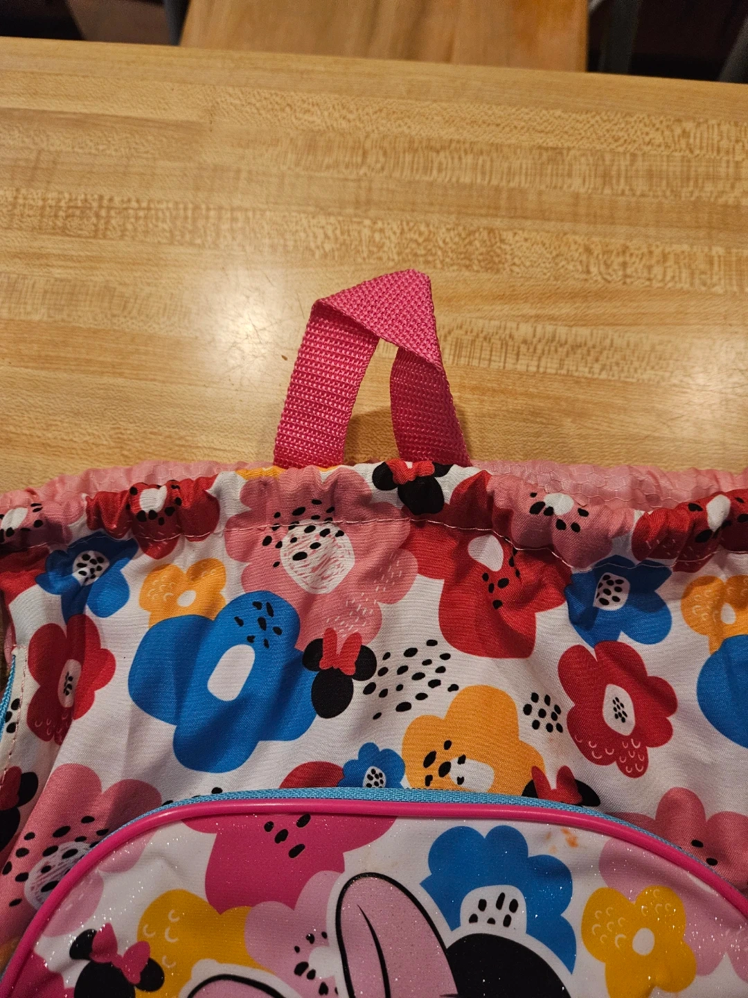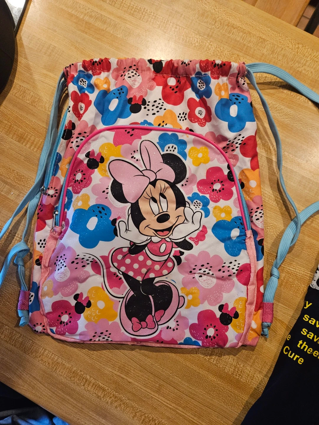 Cute pink drawstring backpack featuring Minnie Mouse and a floral pattern. It's made of polyester and has a zippered front pocket. Perfect for carrying essentials on the go!