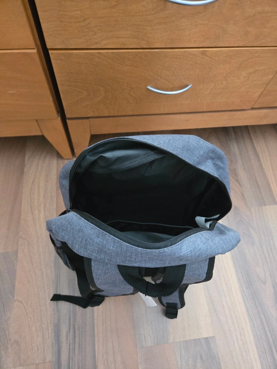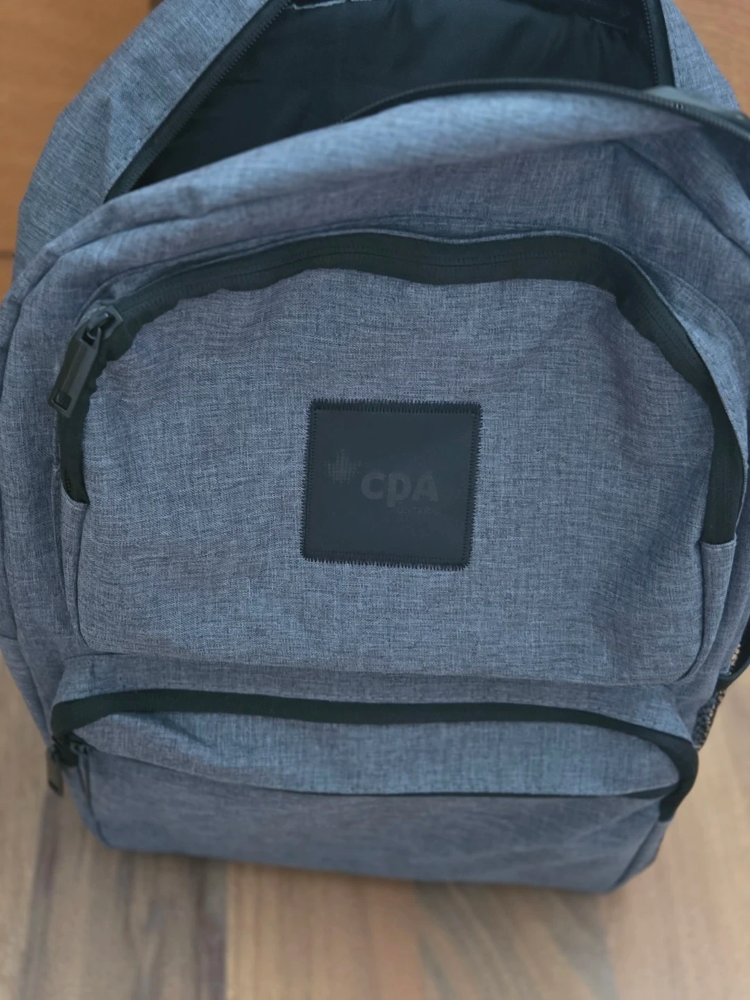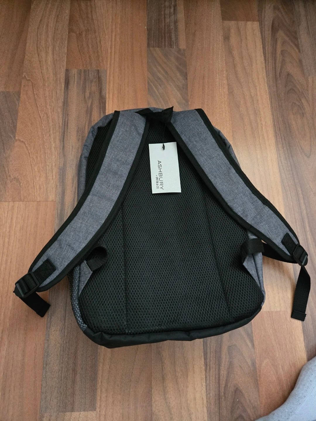 This is an ASHBURY backpack. It's grey with black trim and features multiple pockets and mesh side compartments. It has padded shoulder straps for comfort.