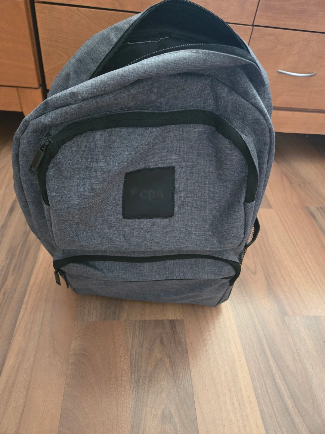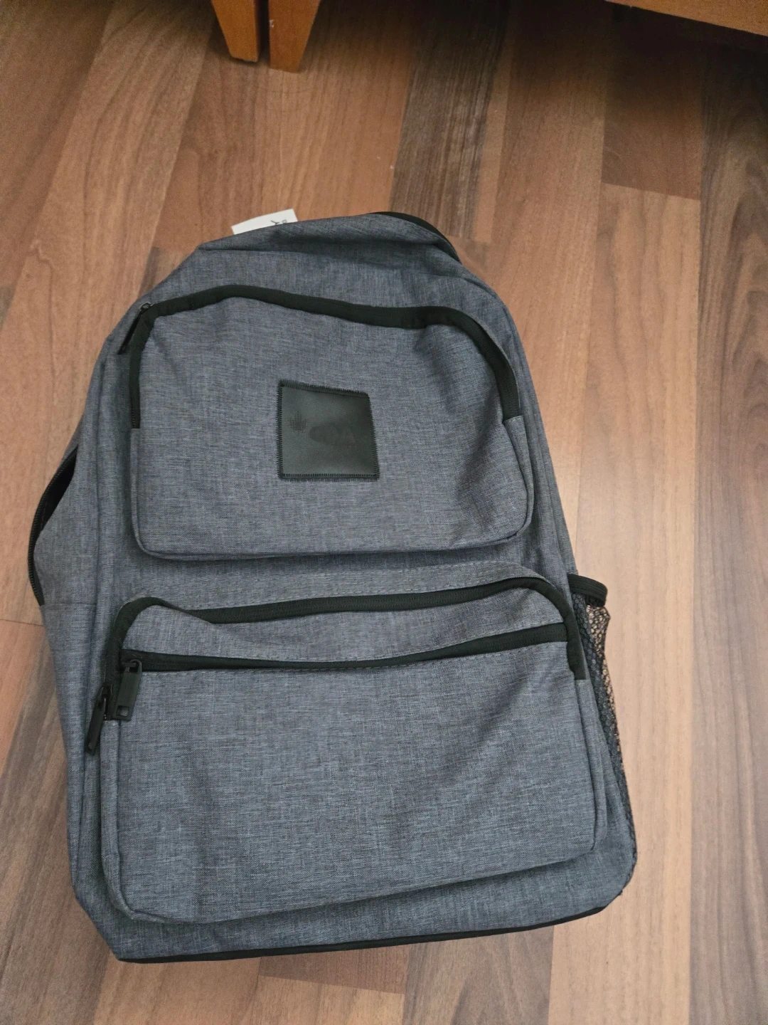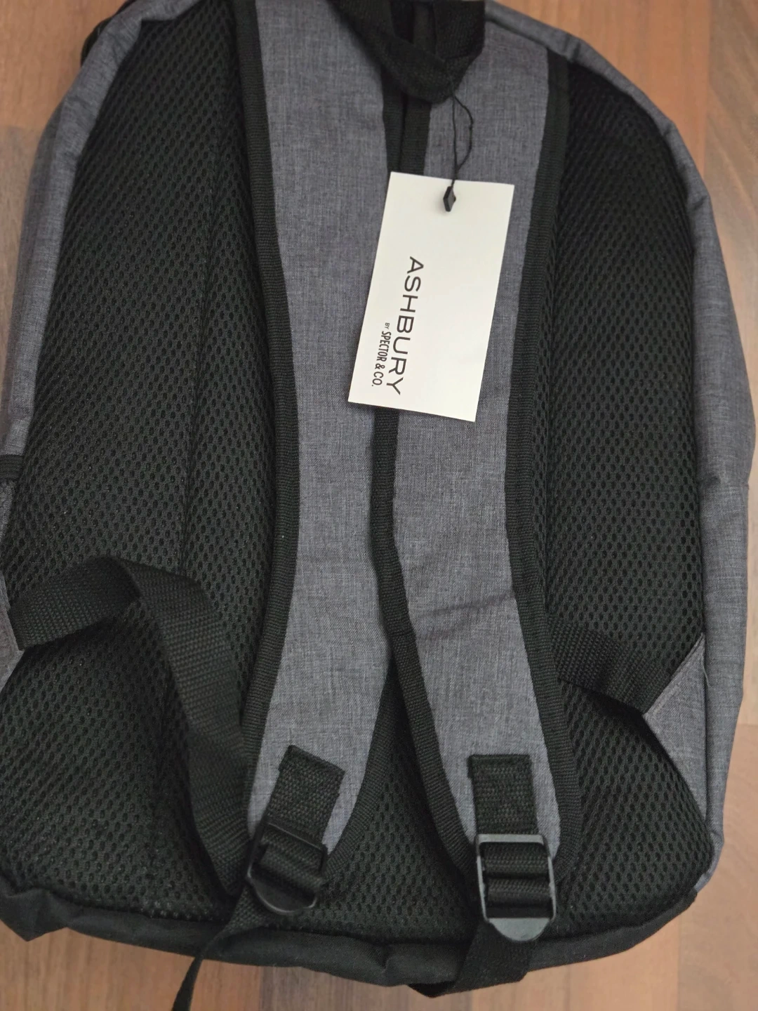 This is an ASHBURY backpack. It's grey with black trim and features multiple pockets and mesh side compartments. It has padded shoulder straps for comfort.