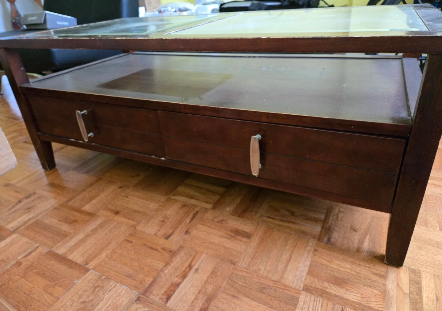 A dark wood coffee table featuring a split glass top. It includes two drawers with silver handles for storage. Great for organizing your living room space!