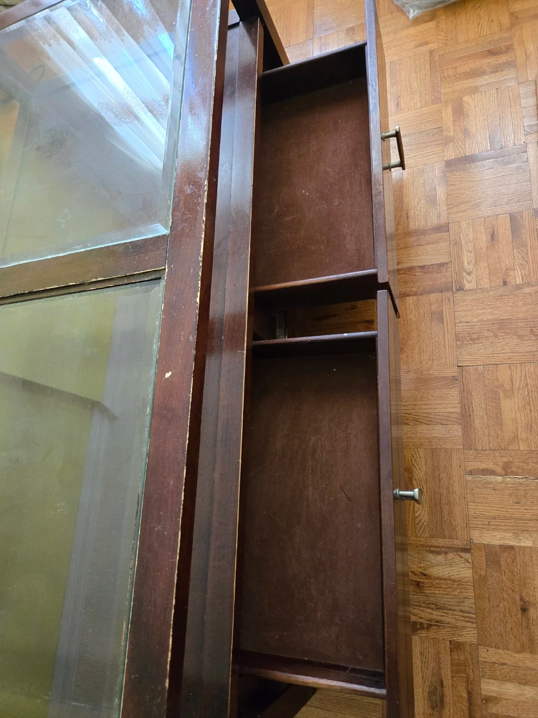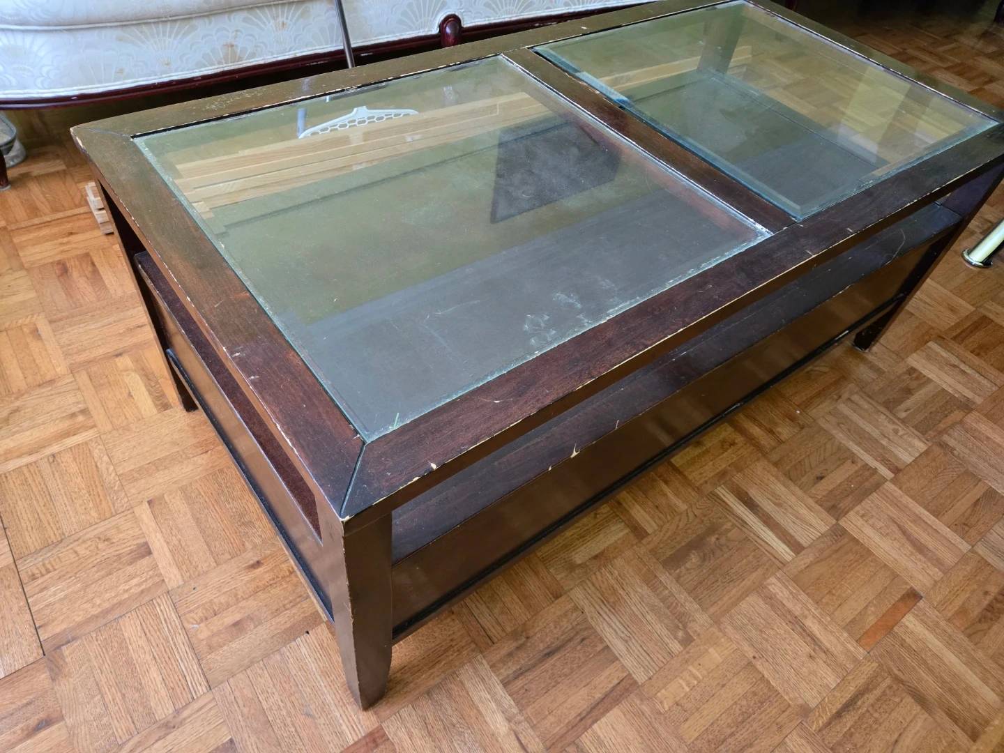A dark wood coffee table featuring a split glass top. It includes two drawers with silver handles for storage. Great for organizing your living room space!