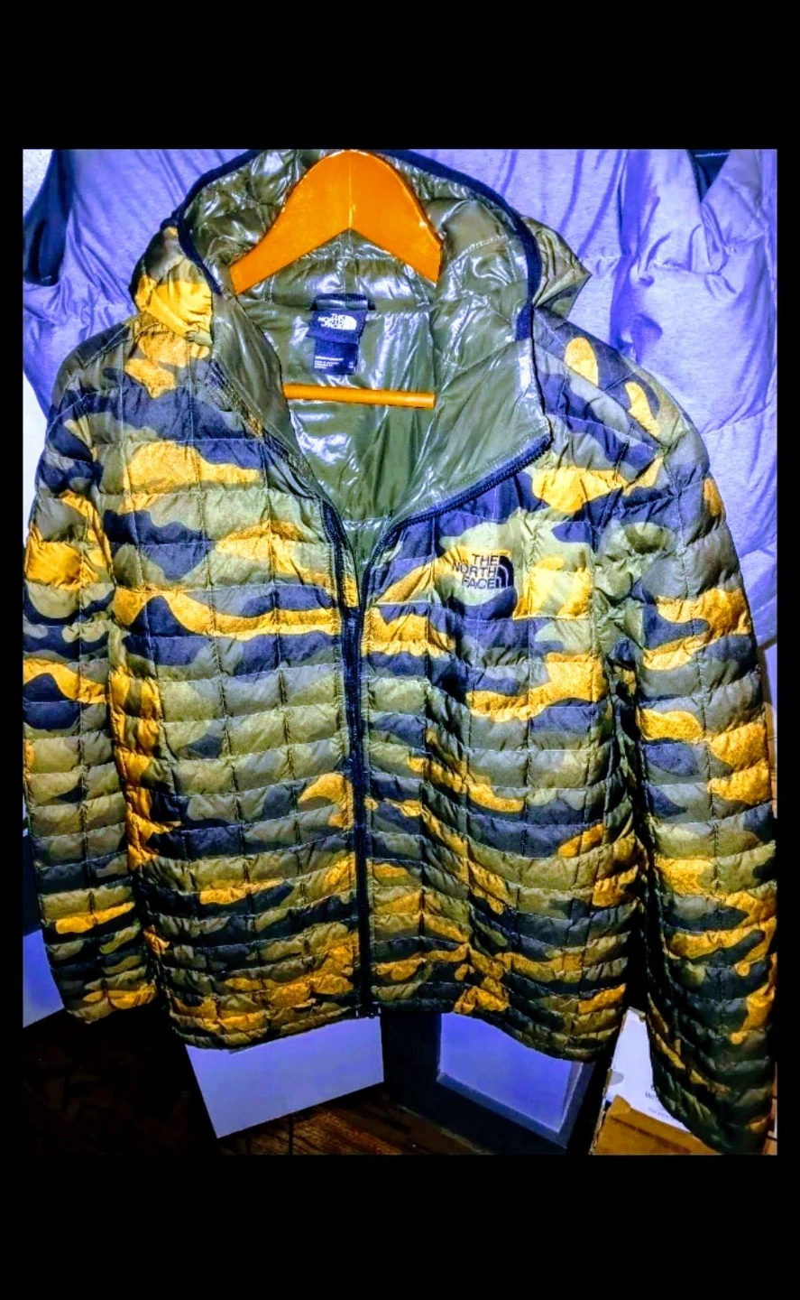 This is The North Face puffer jacket with a cool camouflage pattern. It's a stylish and warm jacket for cooler weather. It's a full-zip front and has a hood.