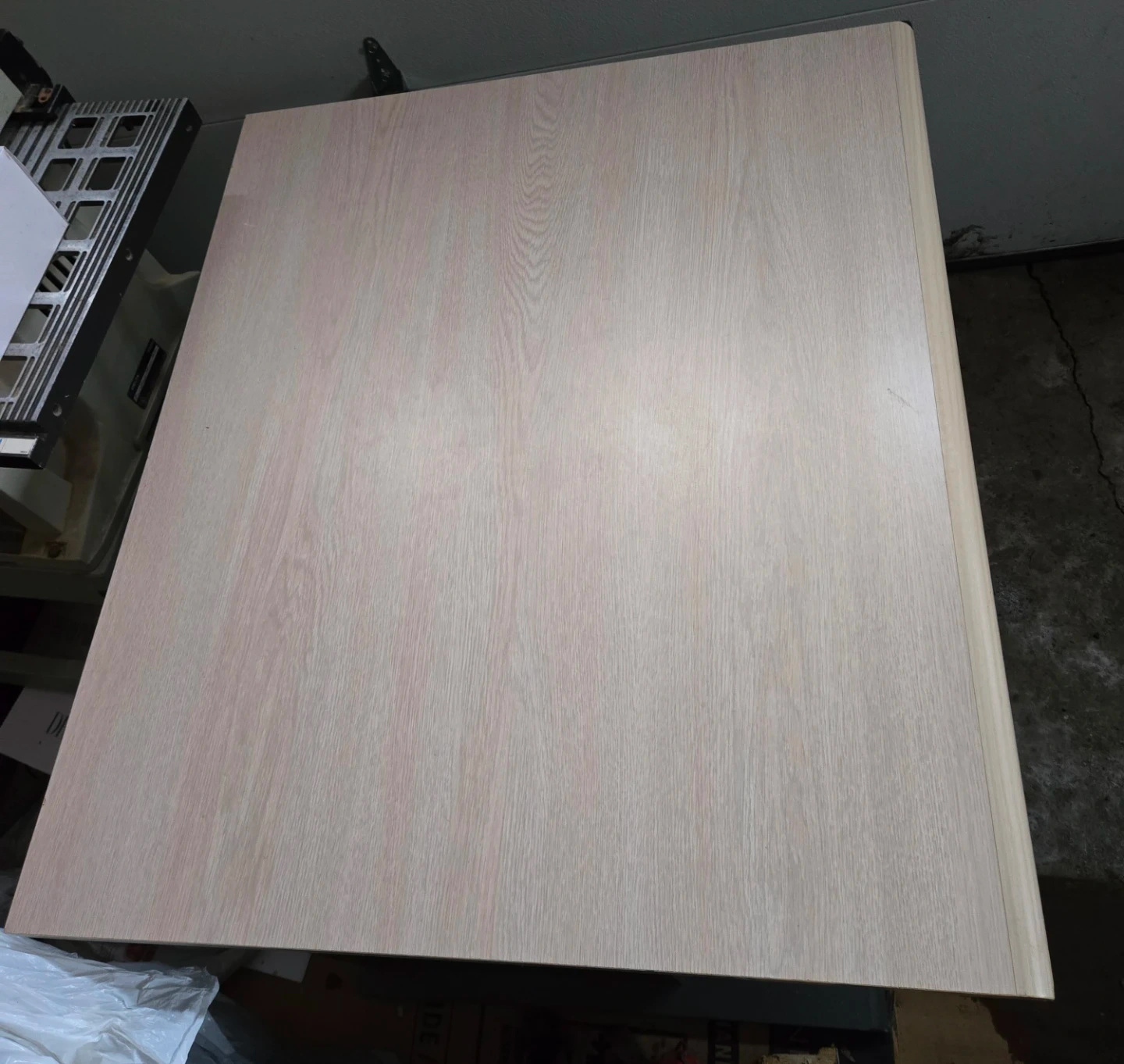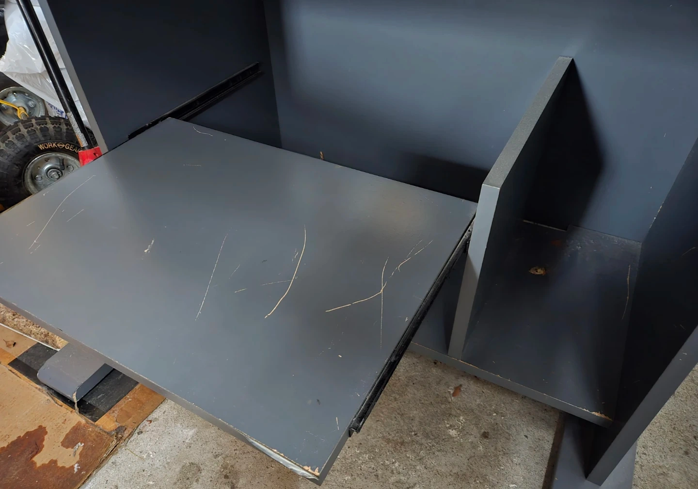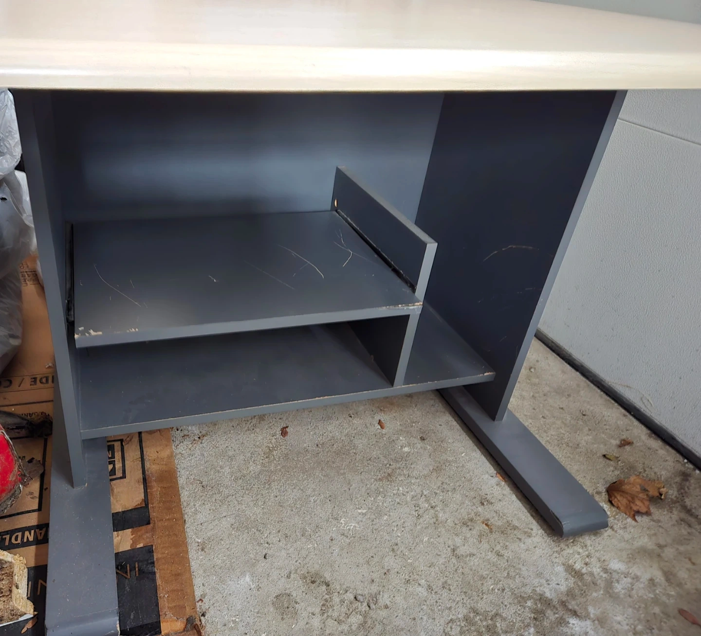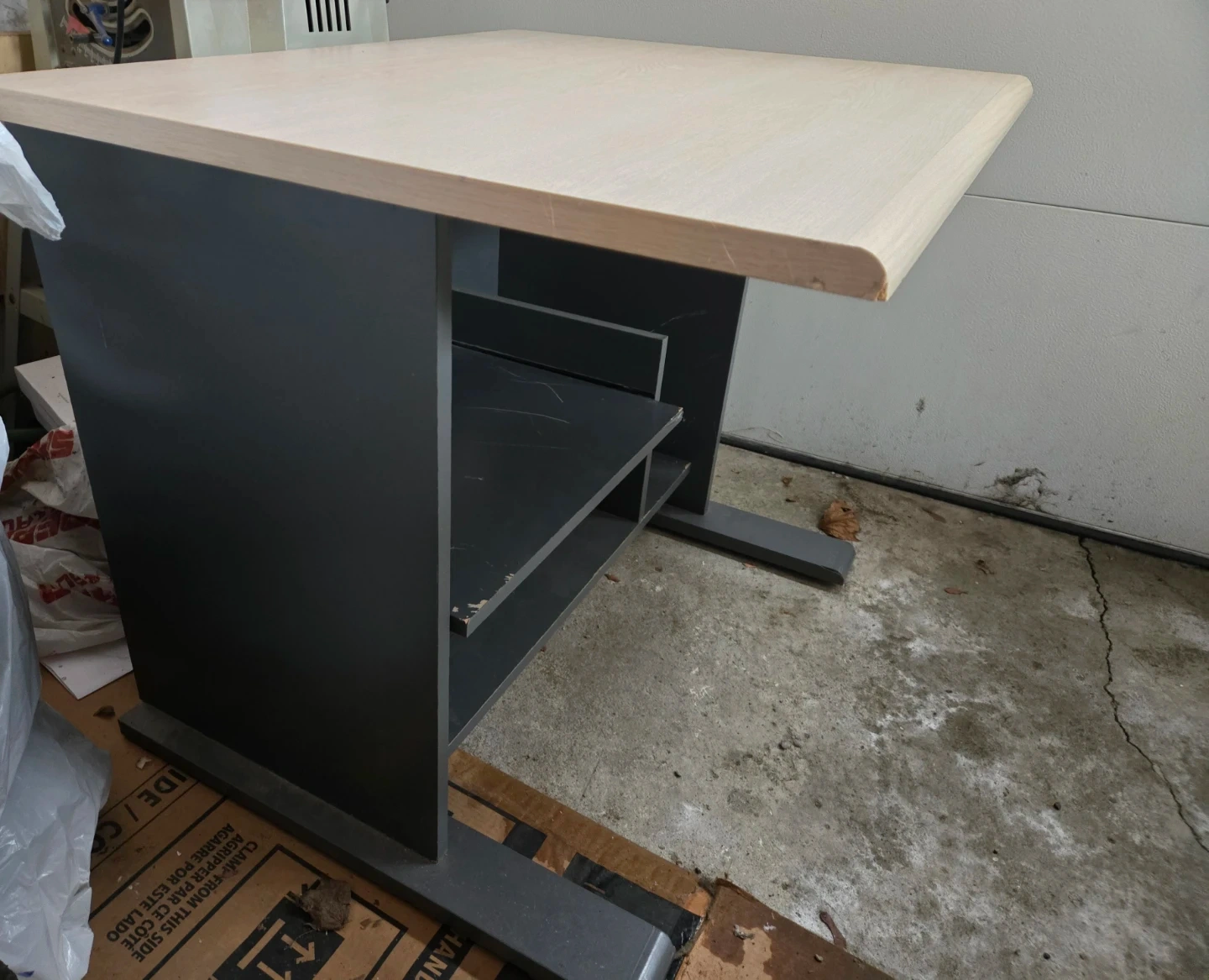 Compact desk with a light wood top and dark grey base. It features a pull-out drawer. Some minor scuffs on surfaces.
