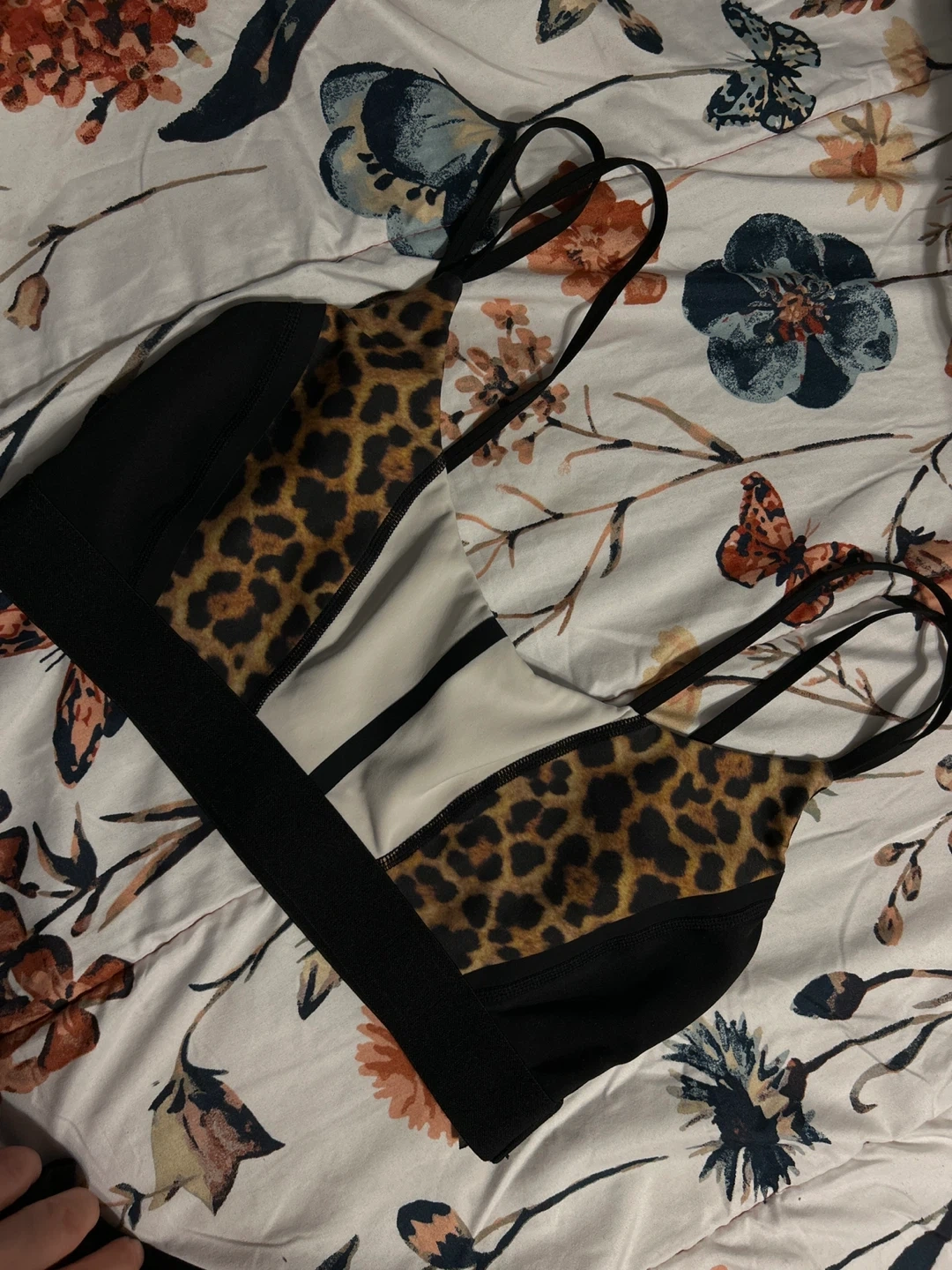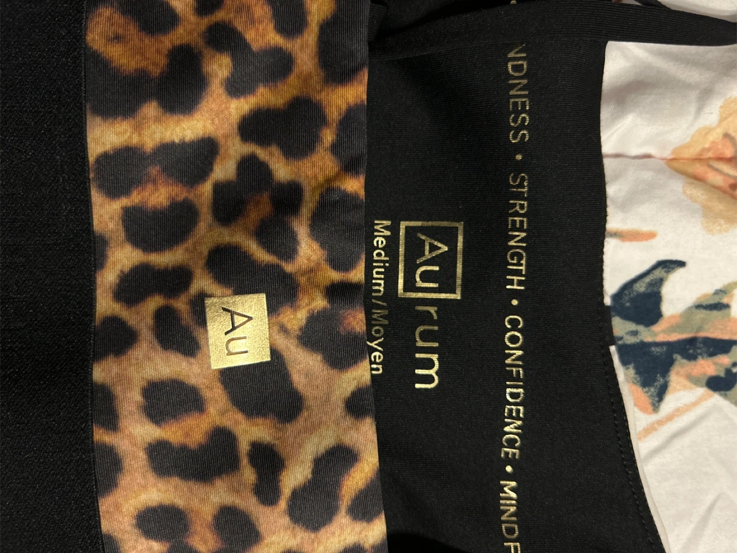 This Aurum sports bra features a stylish leopard print panel. It's made of a comfortable, stretchy material. This bra is size medium. It's great for medium-impact activities! This is my favourite, please whoever is taking it, take care of it! Haha