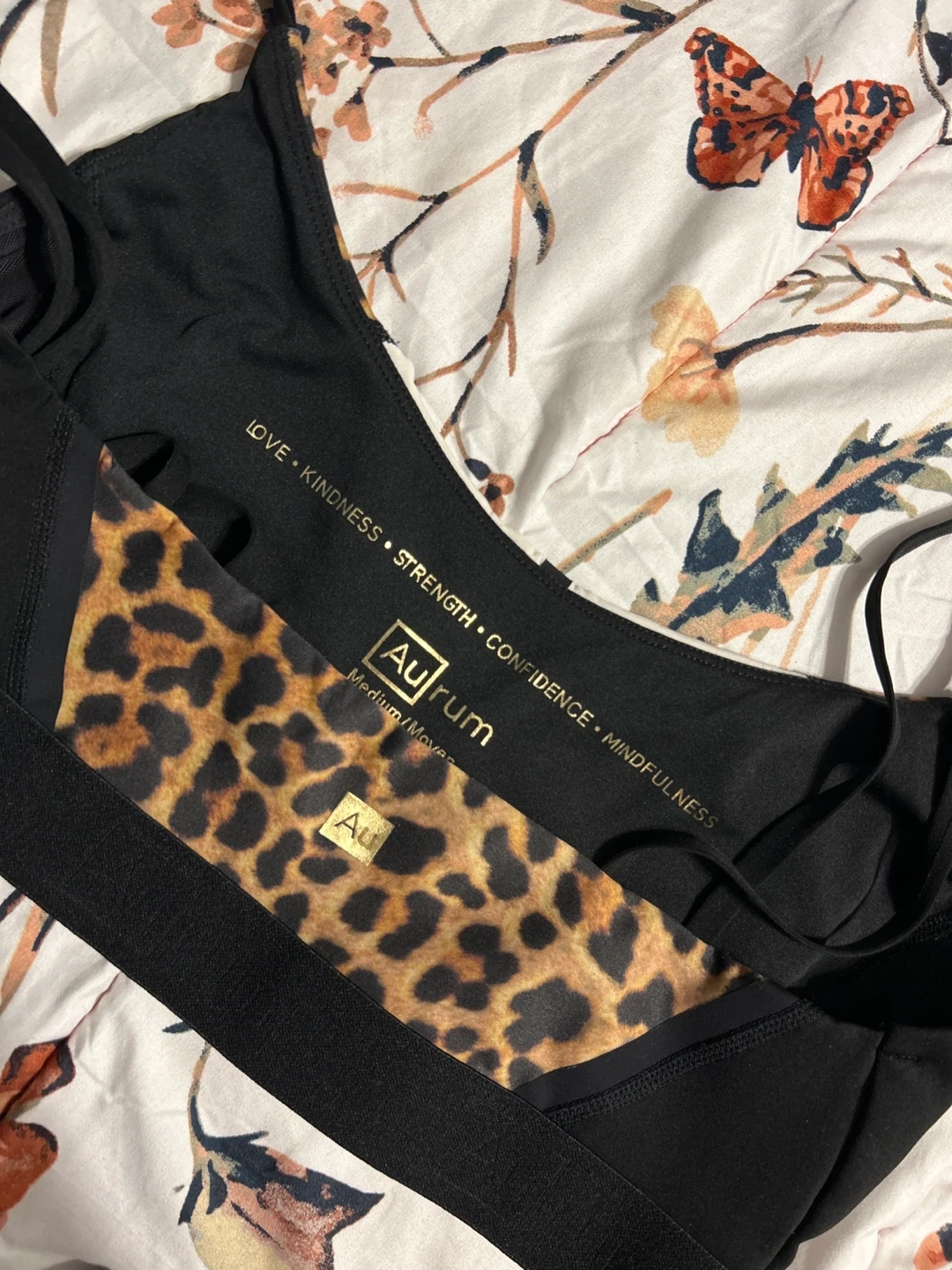 This Aurum sports bra features a stylish leopard print panel. It's made of a comfortable, stretchy material. This bra is size medium. It's great for medium-impact activities! This is my favourite, please whoever is taking it, take care of it! Haha