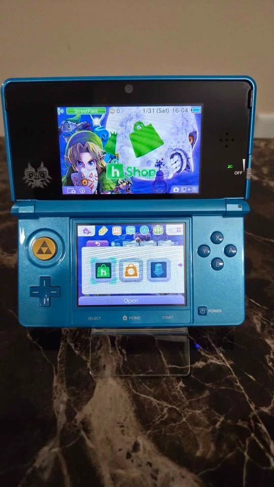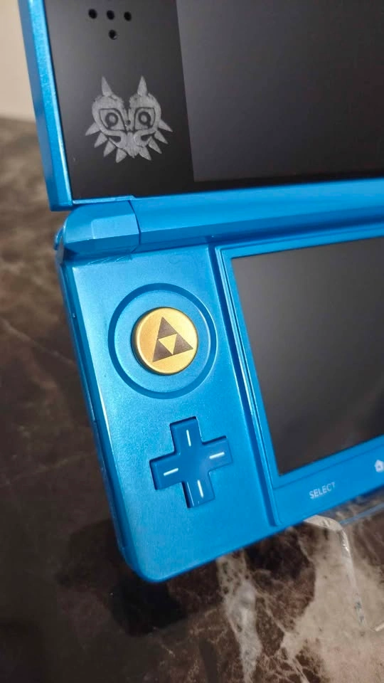 This console has had a brand new durable metal c-pad joystick installed (Triforce engraving, Gold). It also had the standard black plastic top screen lens replaced with a glass one (Majoras Mask laser etched) so the top screen is 100% free of wear and tear.