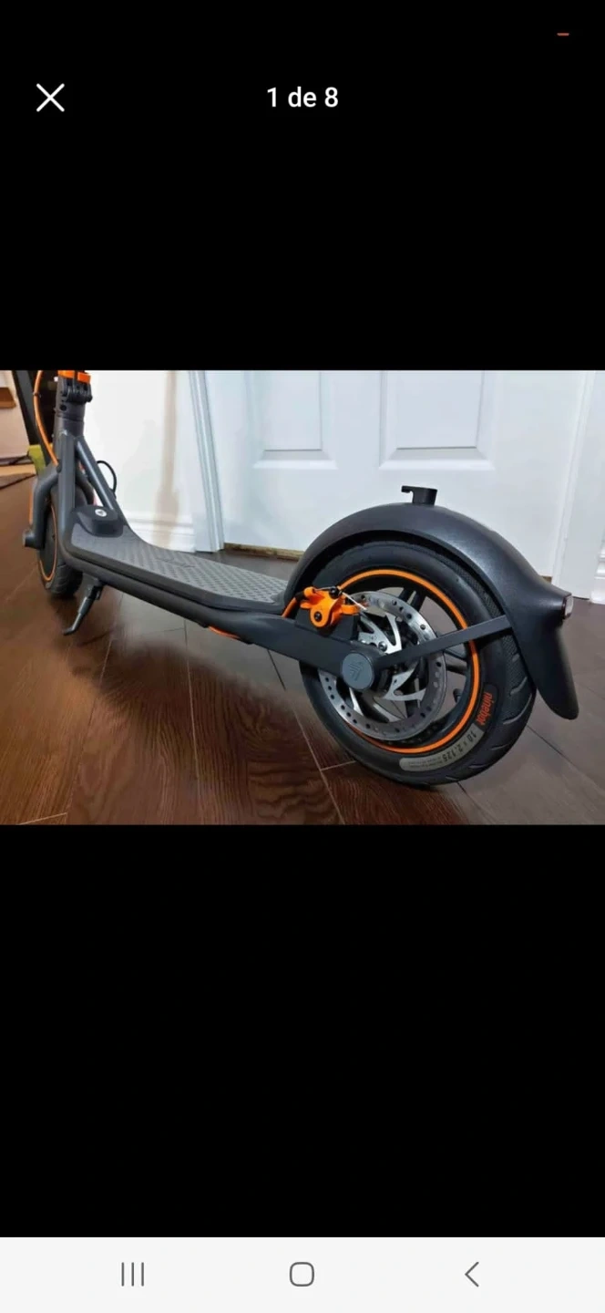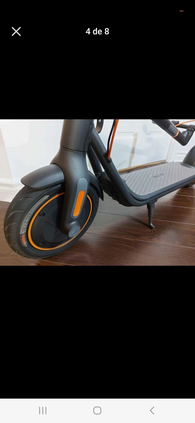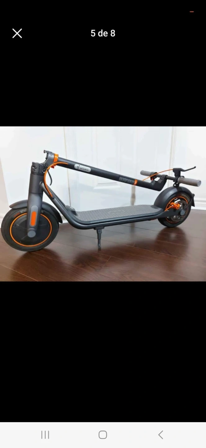 This Segway Ninebot electric kickscooter is dark grey with orange accents. It features a kickstand. Great for getting around town!