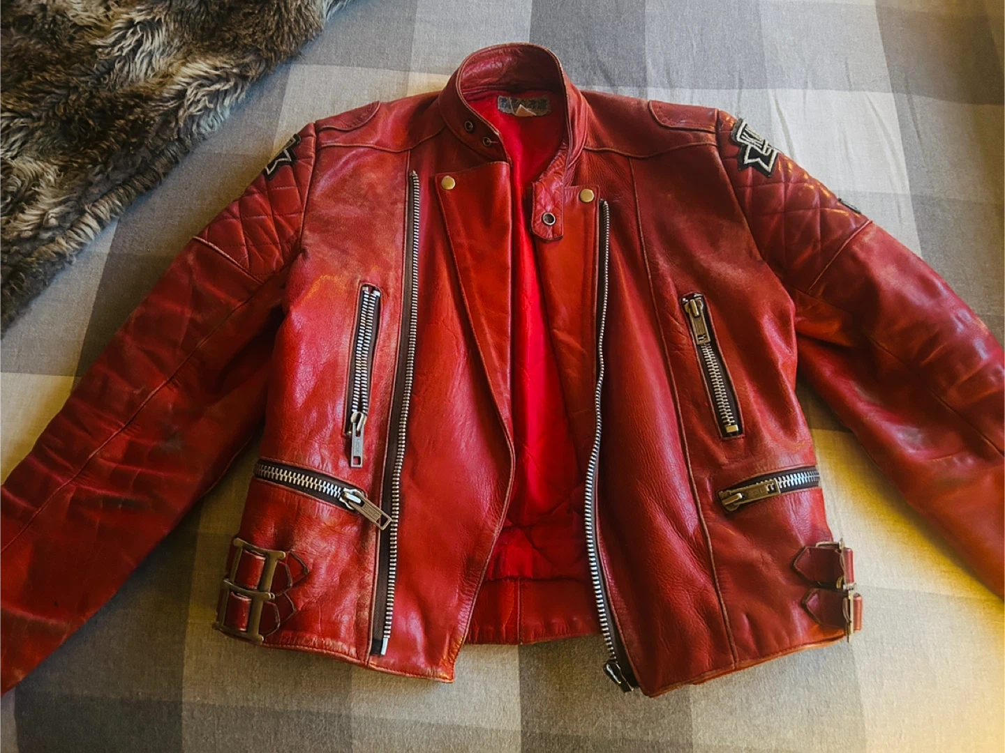 Leather Motorcycle Jacket with KAWASAKI logo patches.