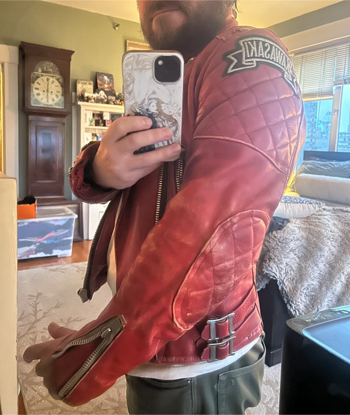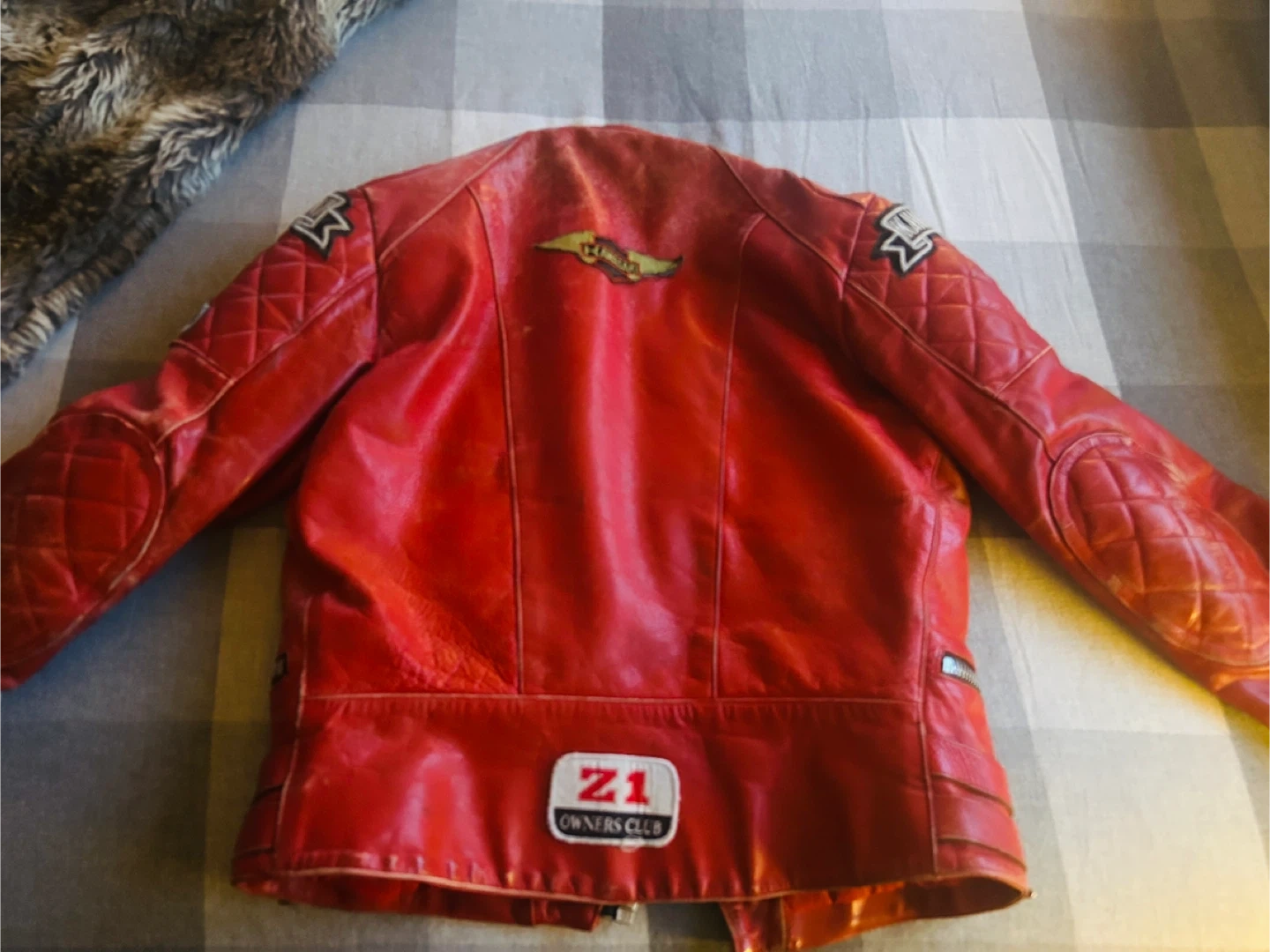 Leather Motorcycle Jacket with KAWASAKI logo patches.