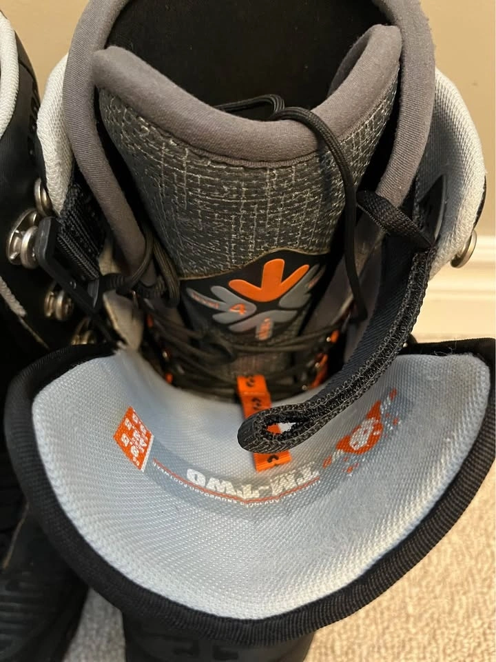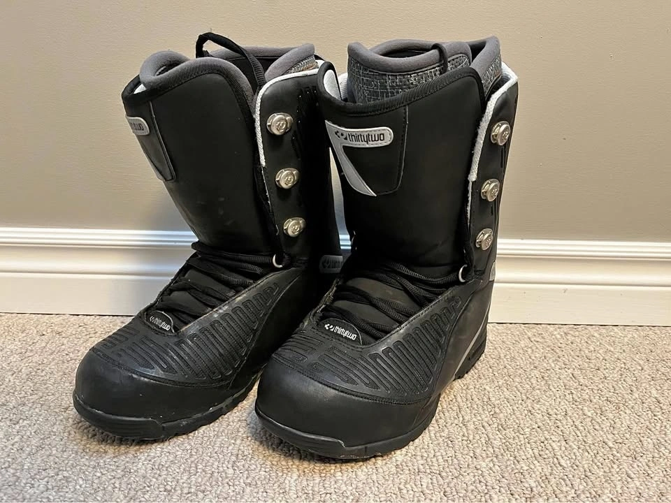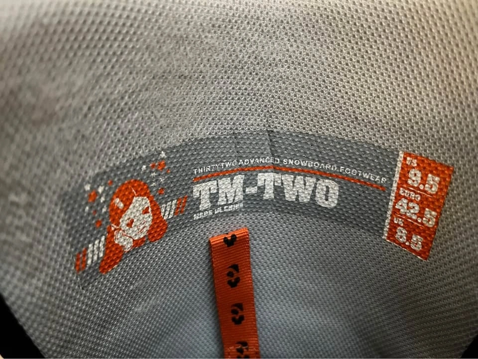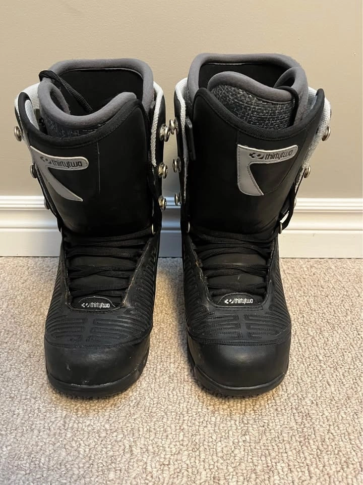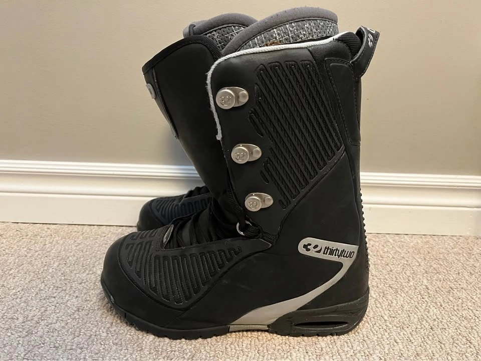 Pretty old pair of snowboard boots by Thirtytwo in men's size 9.5. This boot is true to shoe size. The heels of the soles have separated a bit and have been epoxied back. It’s held up since.