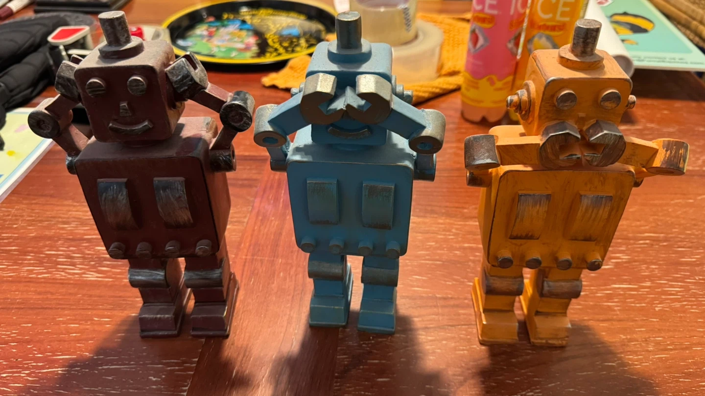 A set of three charming robot figurines posing in the Hear No Evil, See No Evil, Say No Evil style. Red, blue, and orange in a lightweight resin.