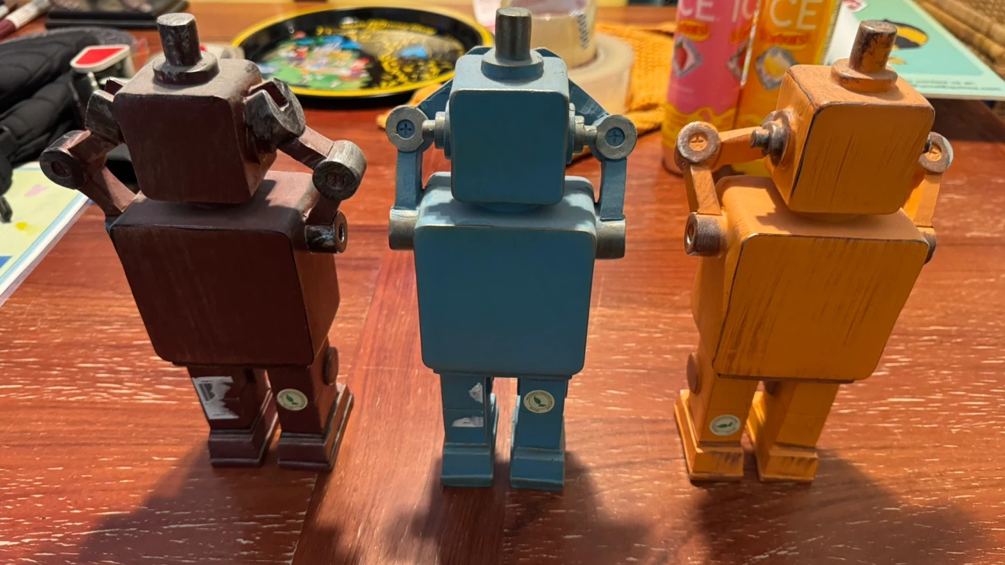 A set of three charming robot figurines posing in the Hear No Evil, See No Evil, Say No Evil style. Red, blue, and orange in a lightweight resin.