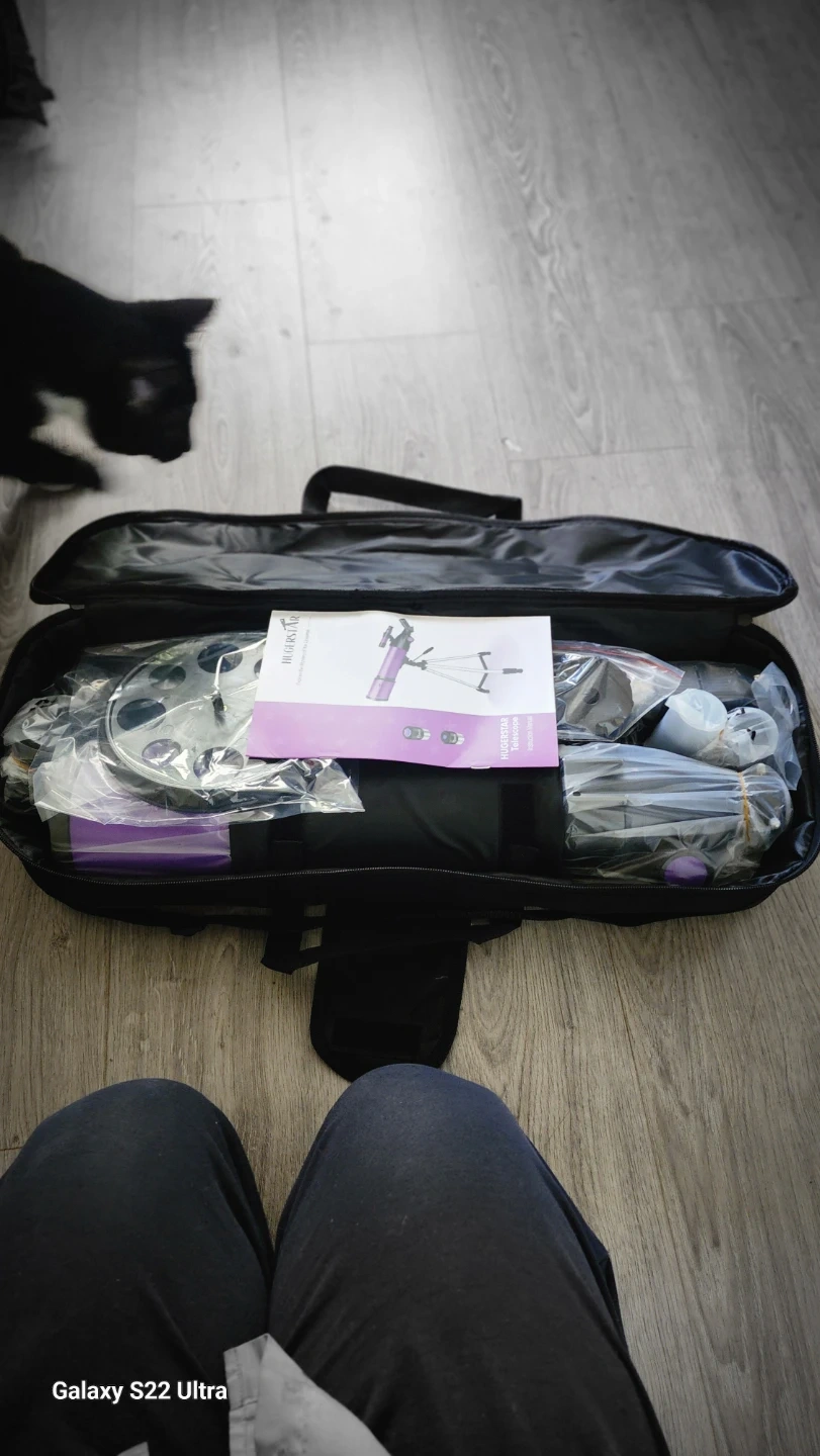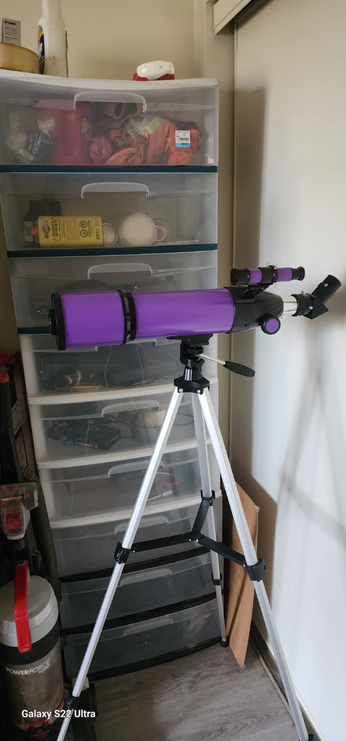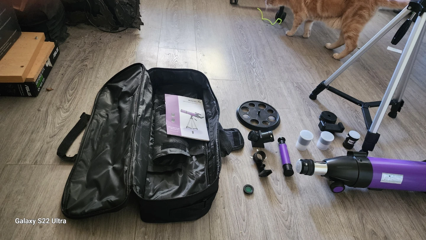 This HugerStar astronomical telescope comes with a carrying bag and all its original accessories. It's purple and includes a tripod for stable viewing. A great starter telescope for exploring the night sky!