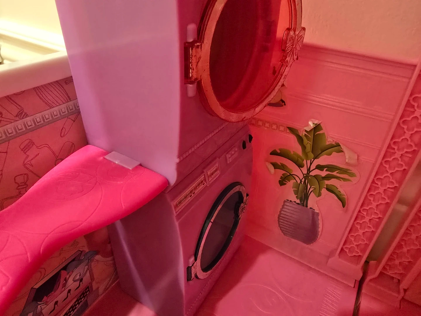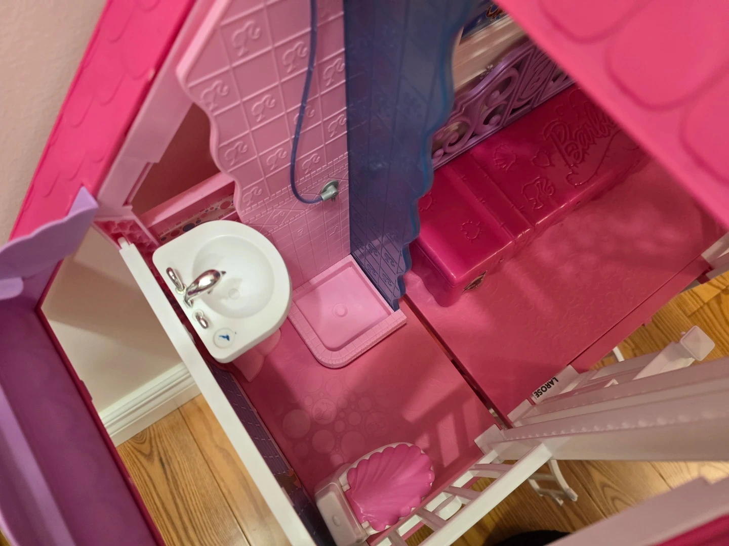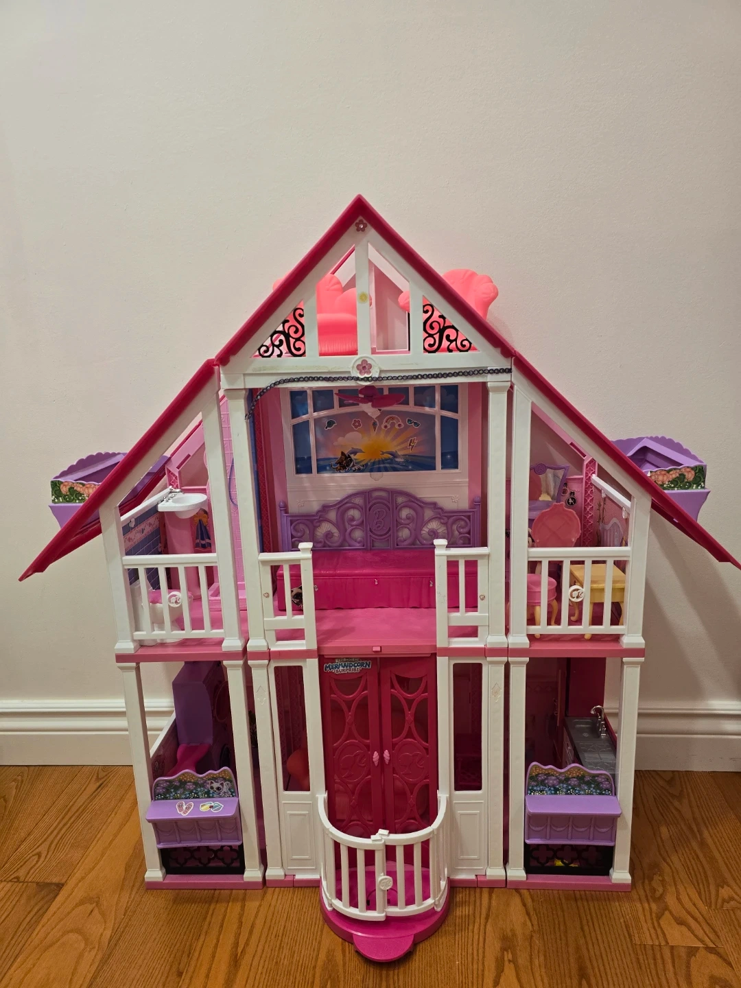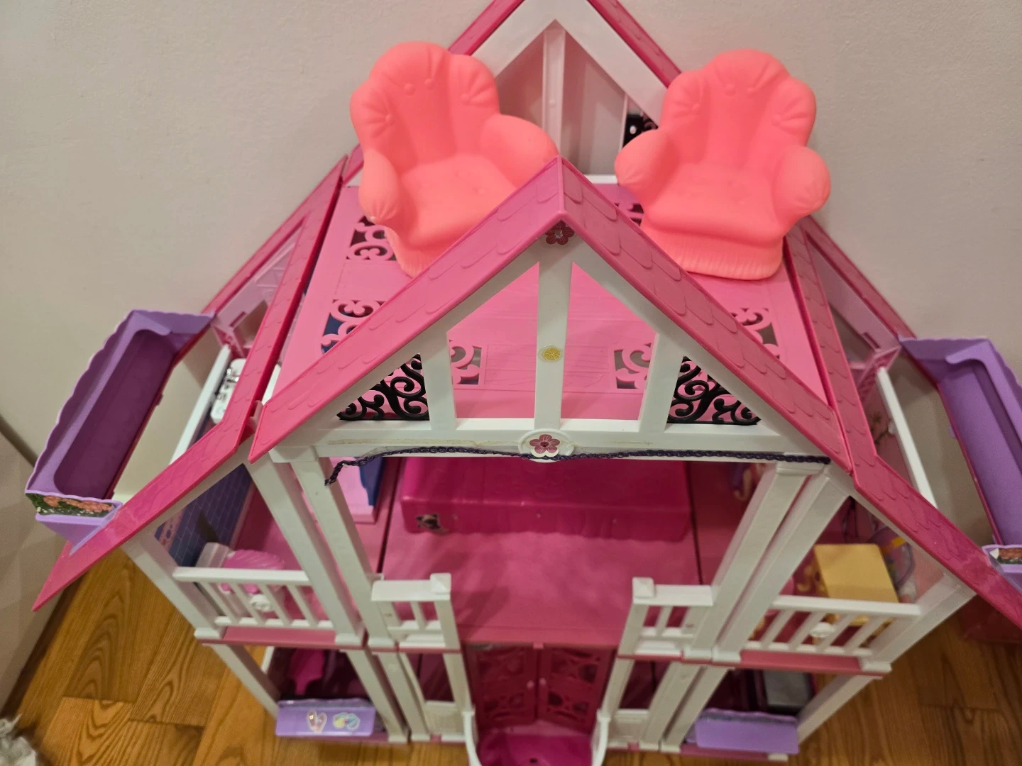 This is a Barbie Dreamhouse dollhouse with multiple levels and rooms. It includes furniture like a bed, chairs, and a kitchen set. The dollhouse is made of plastic and is primarily pink and white. It's a fun playset for imaginative adventures!