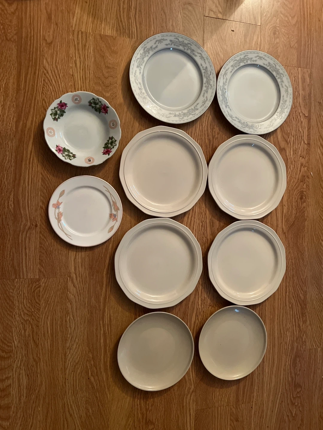 This is a mixed set of nine plates and bowls, featuring a variety of styles. It includes two plates with a delicate floral rim design and a patterned border, and seven solid-coloured plates and bowls in neutral tones. Add to your existing collection or use for everyday meals!