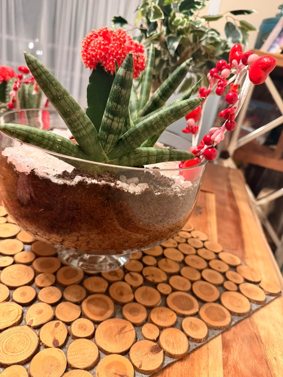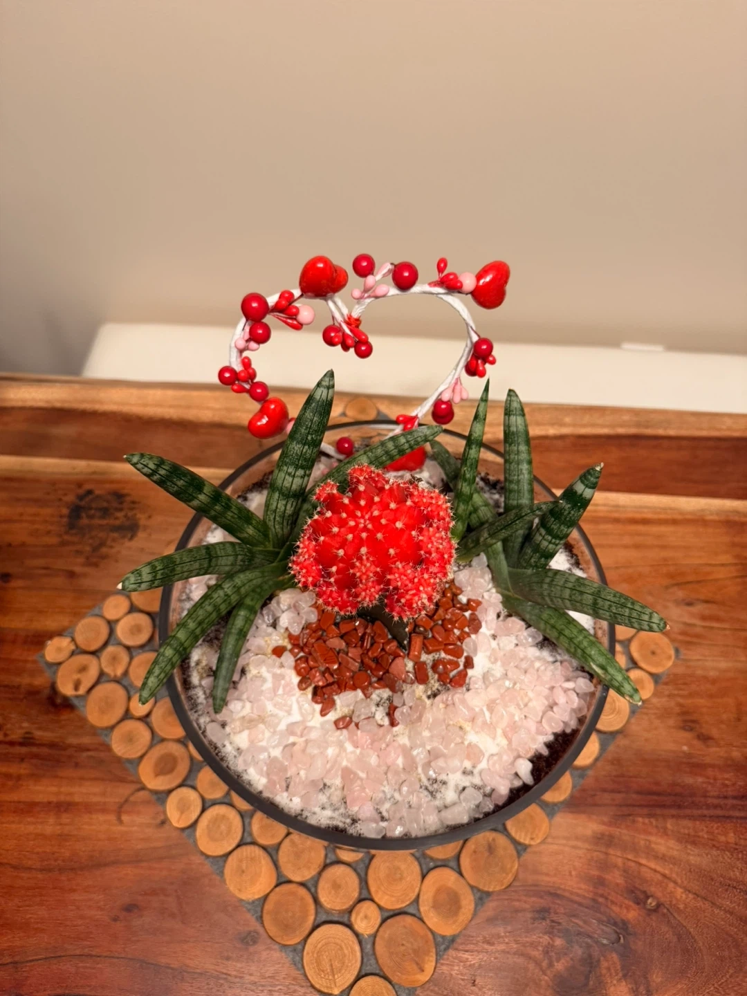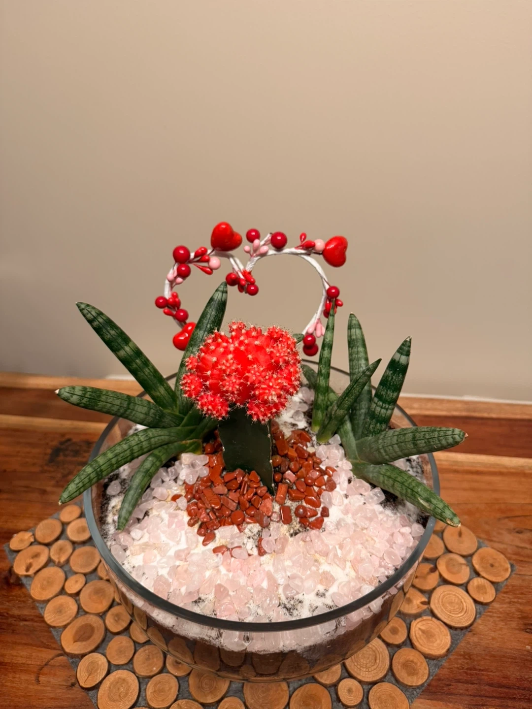 A beautiful glass terrarium filled with various succulents and a red moon cactus. It's decorated with red berry accents and white and pink decorative stones. This terrarium makes a lovely statement piece for any home.
