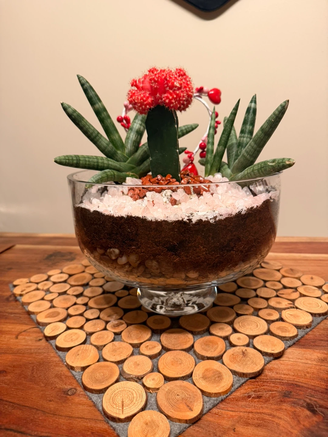 A beautiful glass terrarium filled with various succulents and a red moon cactus. It's decorated with red berry accents and white and pink decorative stones. This terrarium makes a lovely statement piece for any home.