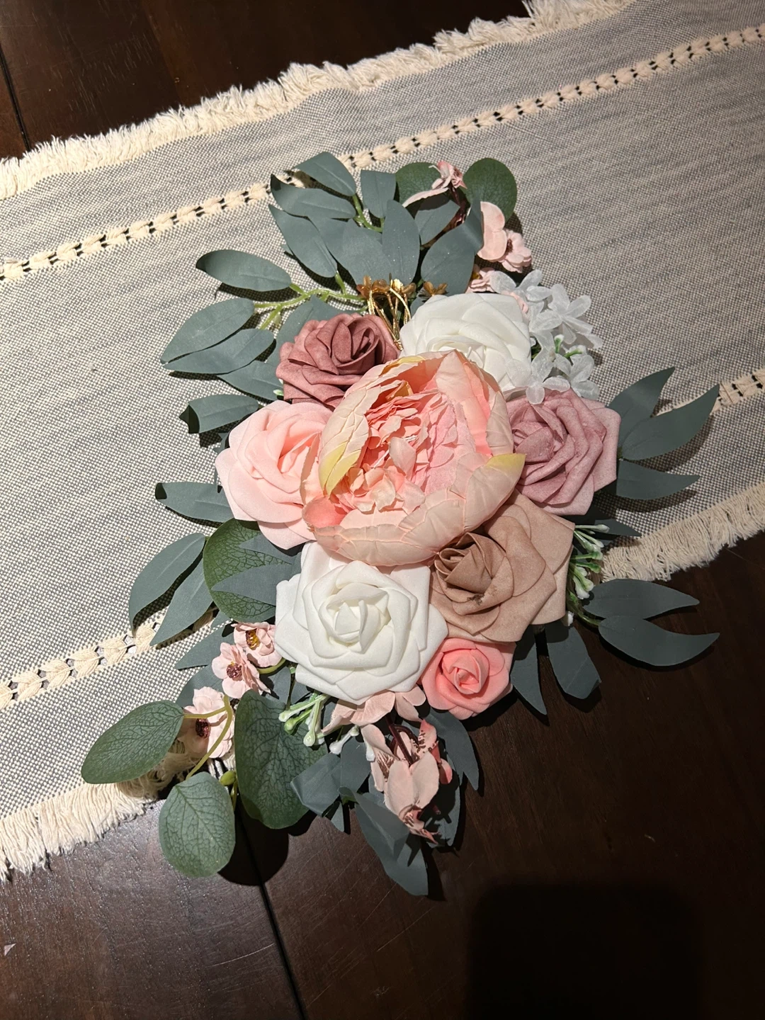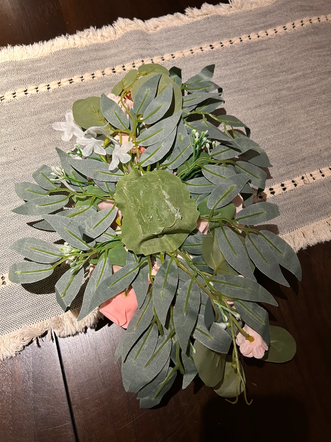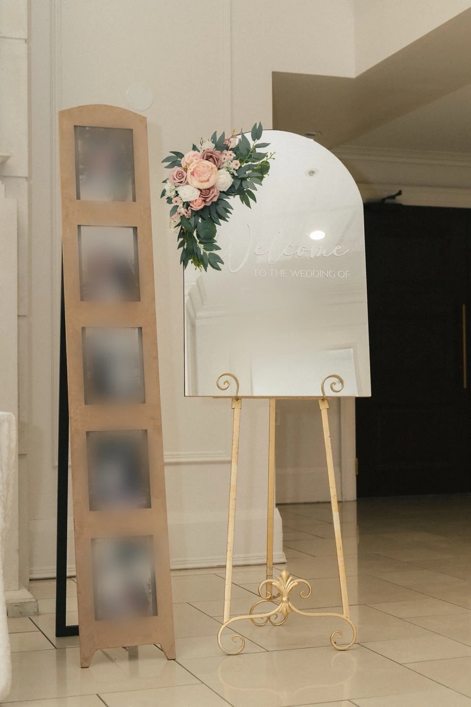 I have an additional floral arrangement for you to add it to the bottom edge of the mirror. It’s easy to glue the flower arrangement on the mirror with a hot glue gun and it’s easy to remove it without damage. It's perfect for greeting guests at your ceremony or reception.