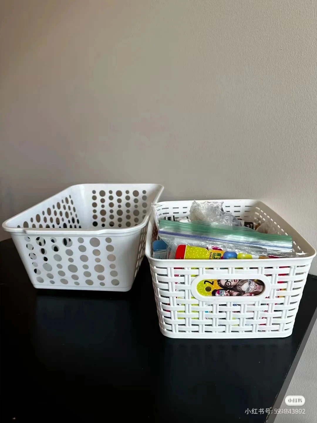 White plastic storage baskets are available. One basket has a dot pattern and the other has a woven pattern with handles. They're great for organizing small items.