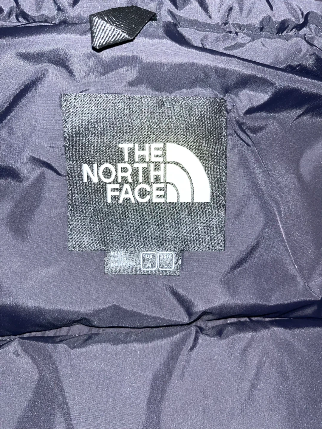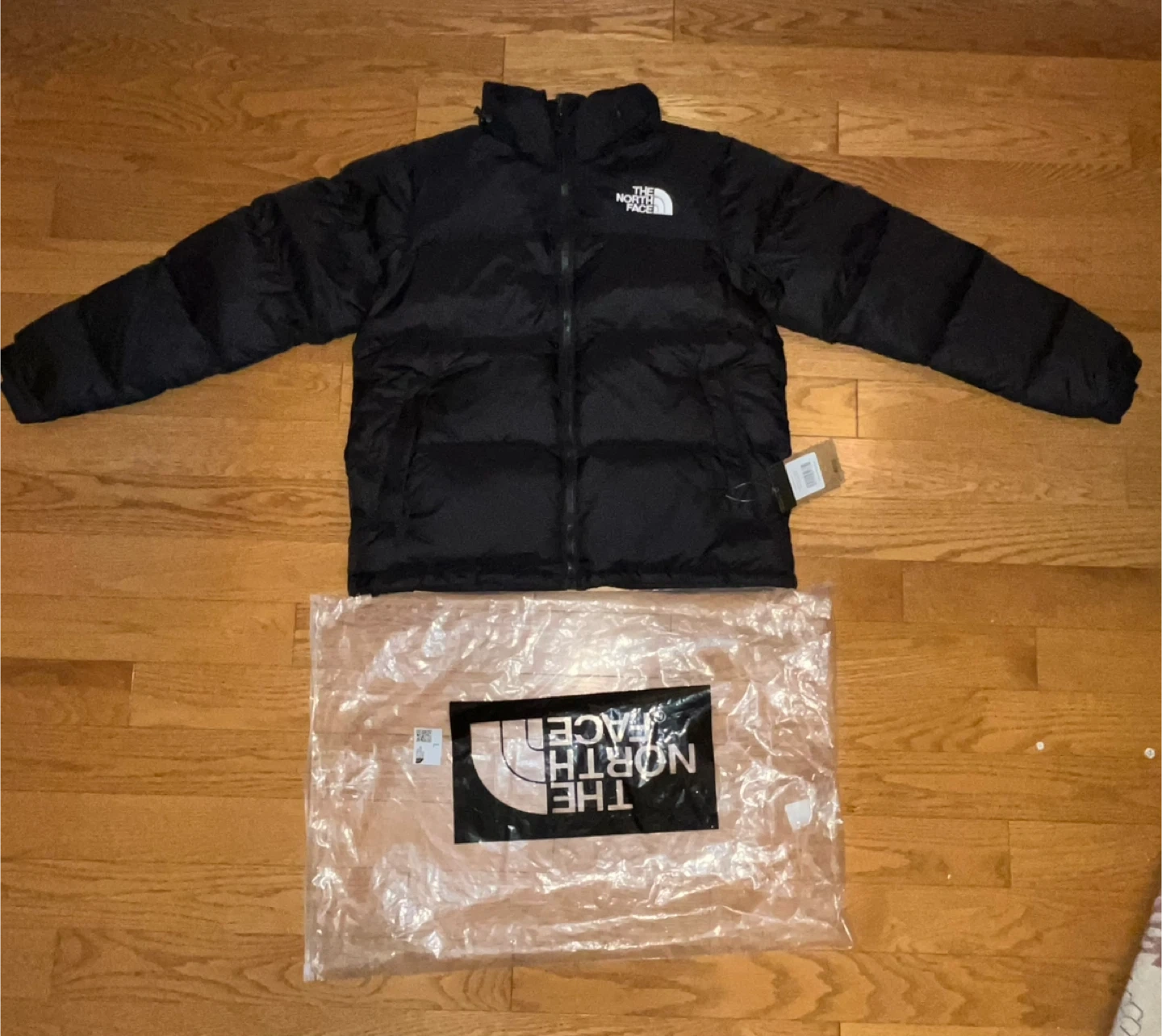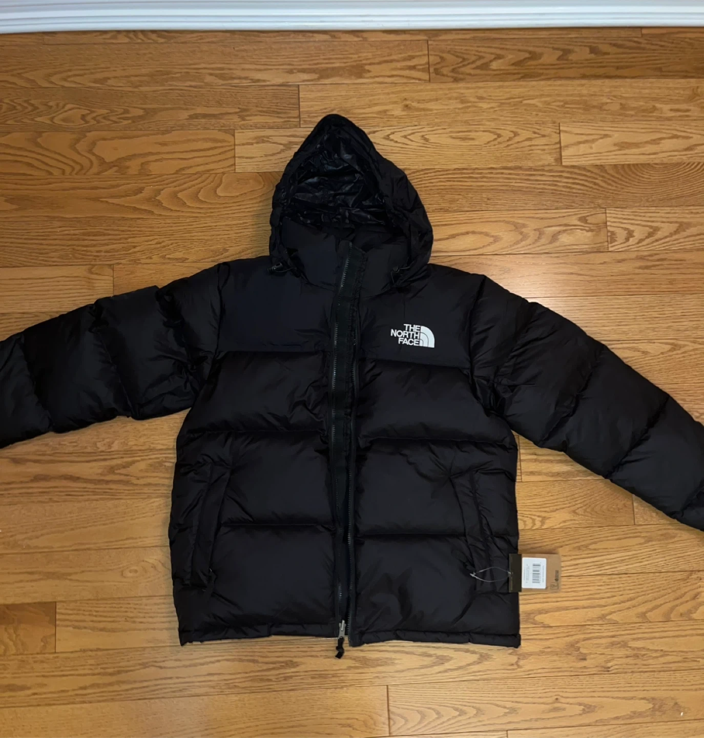 This is a black puffer jacket from The North Face. It's a medium size. It includes a hood and comes in its original bag.