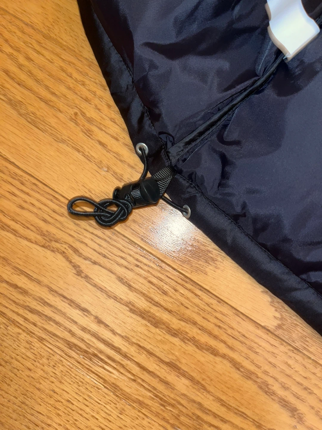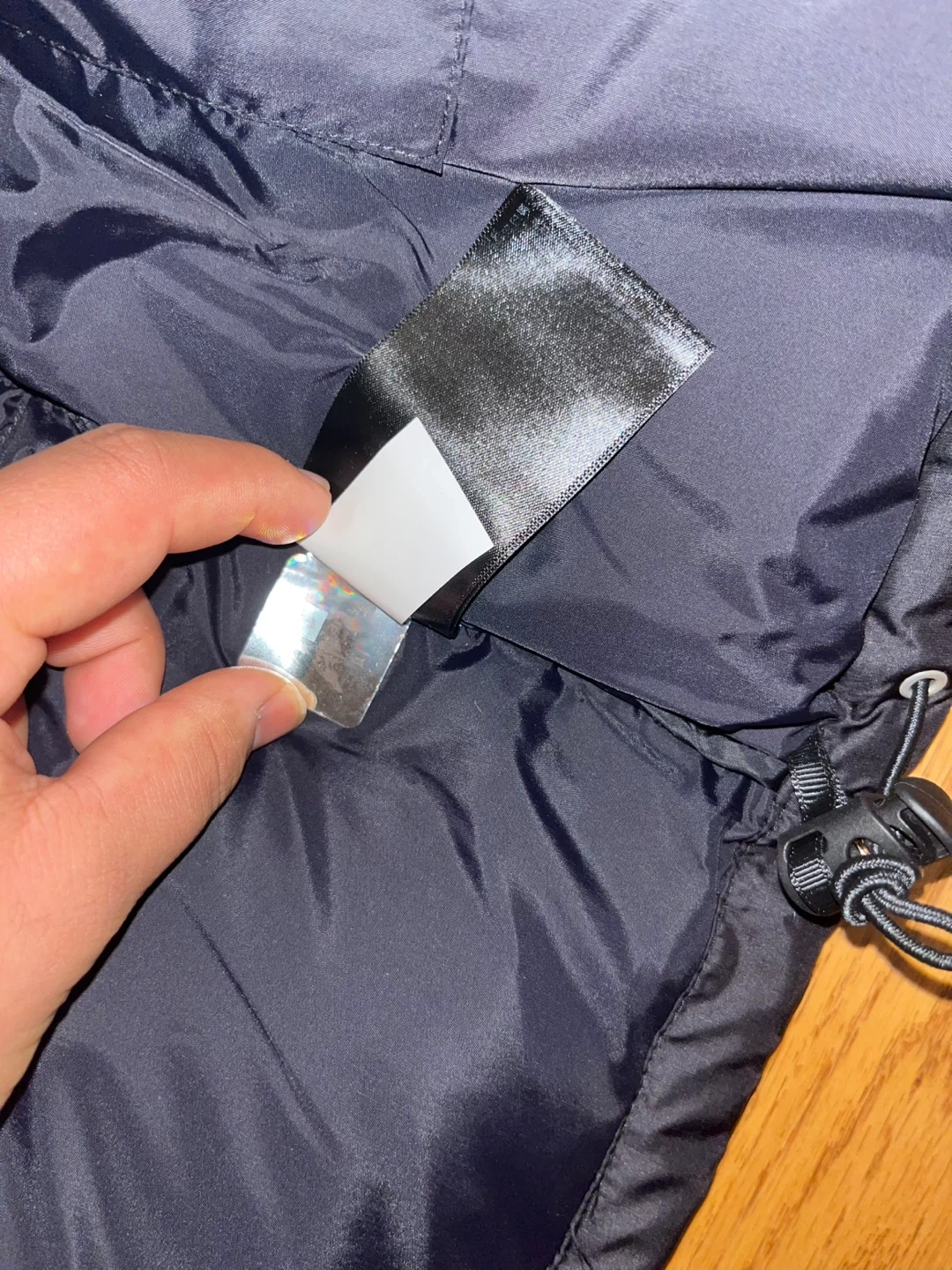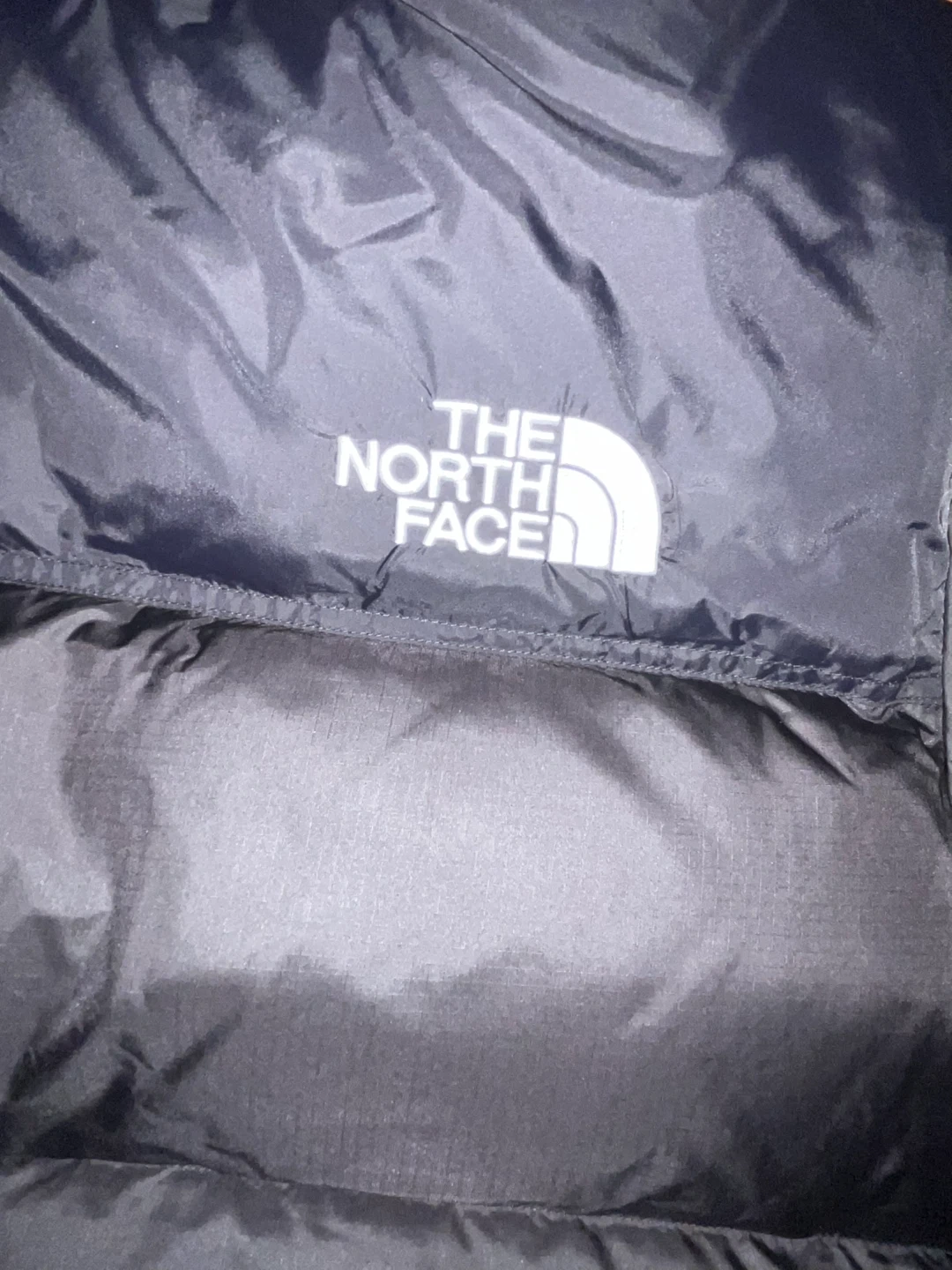 This is a black puffer jacket from The North Face. It's a medium size. It includes a hood and comes in its original bag.