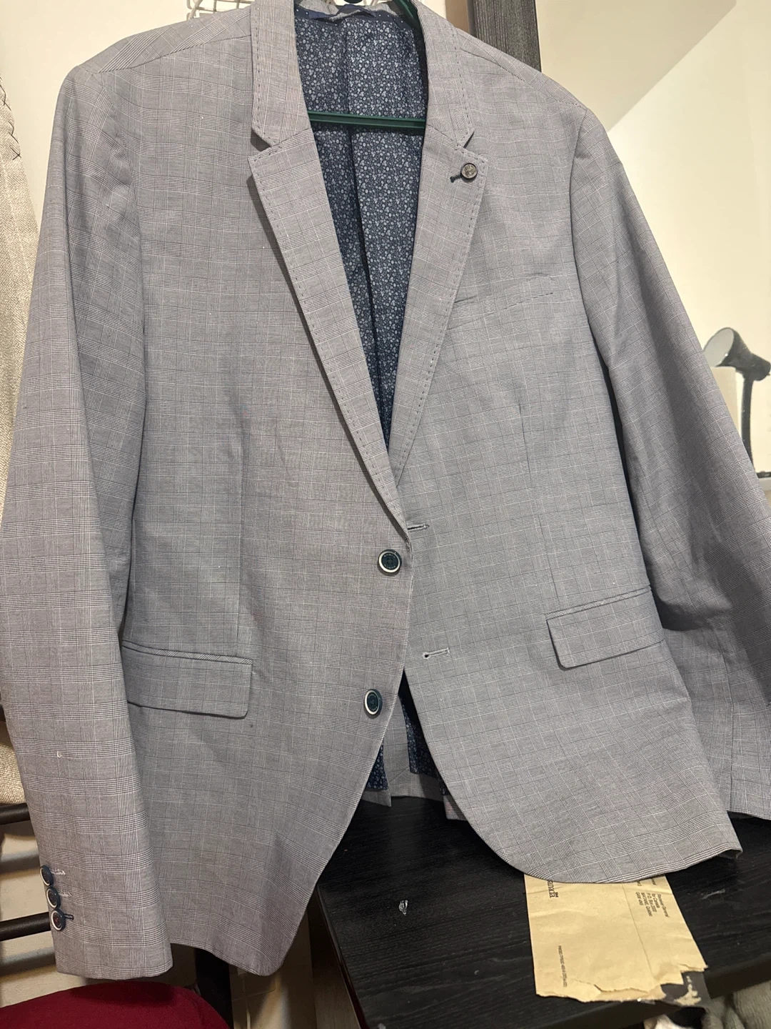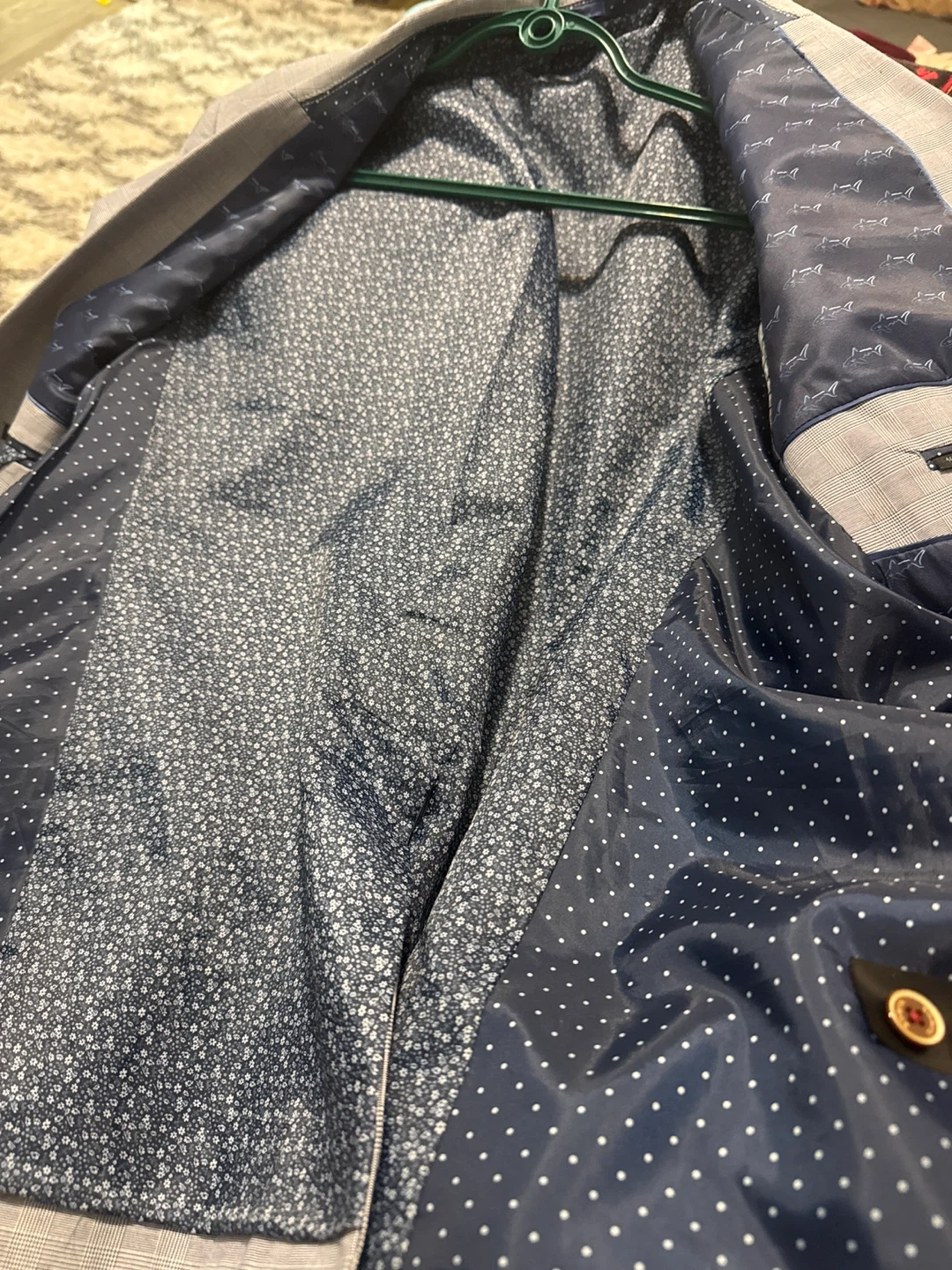 This RW&CO. blazer is a stylish grey colour with a subtle plaid pattern. It features a unique shark print lining and has two button closures. Size 46.