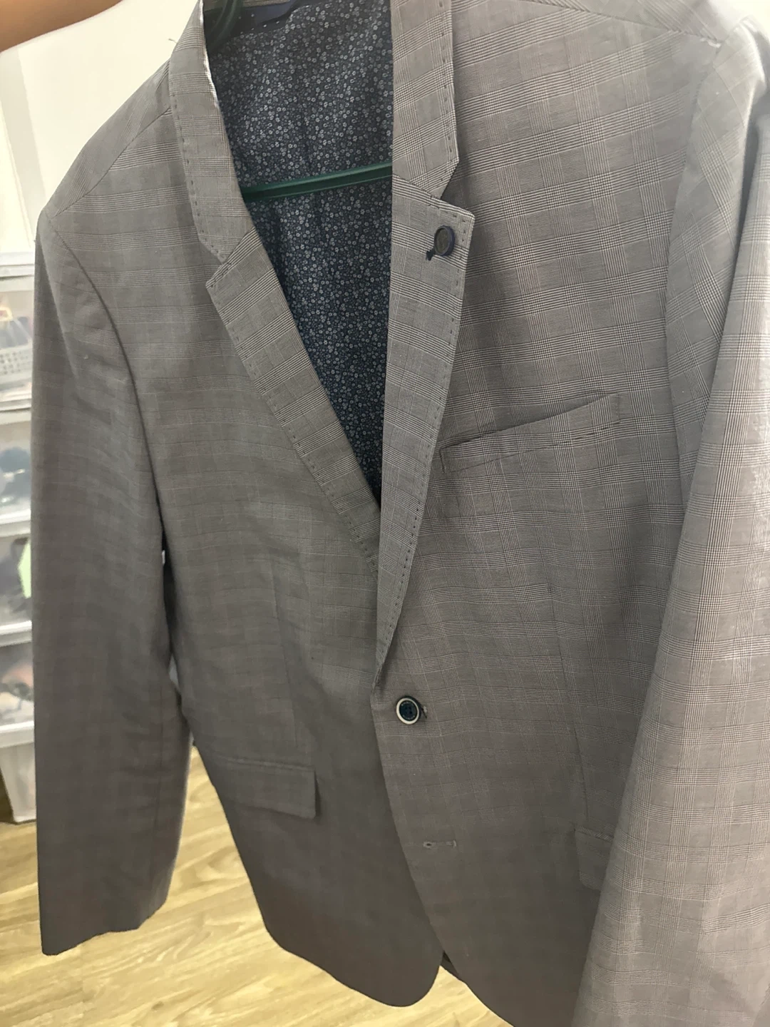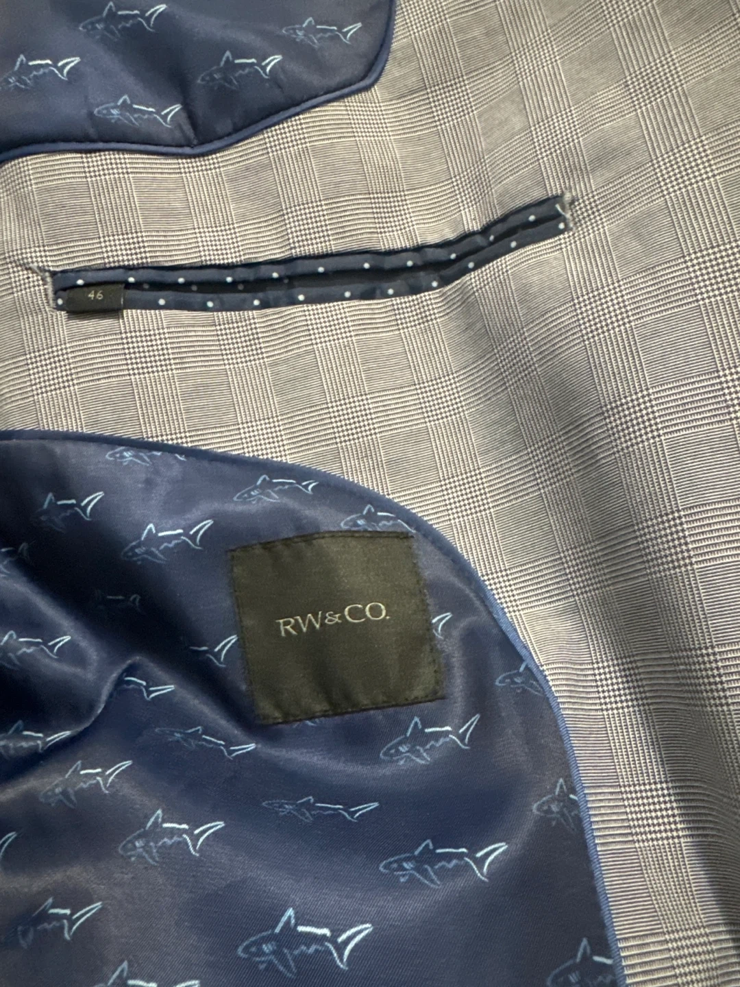 This RW&CO. blazer is a stylish grey colour with a subtle plaid pattern. It features a unique shark print lining and has two button closures. Size 46.