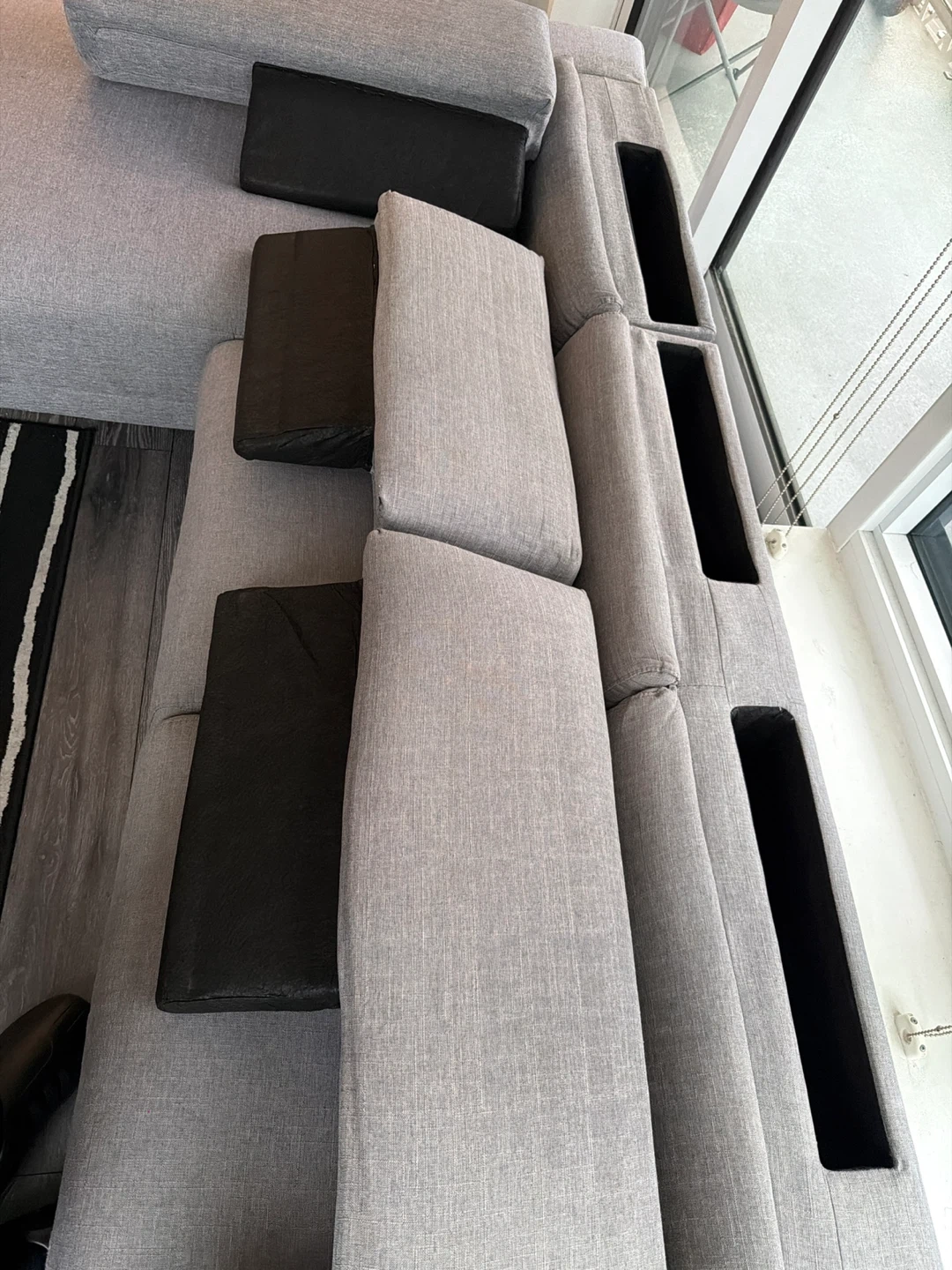 Comfortable light grey fabric sectional sofa. It features adjustable headrests for customized support. This sofa offers ample seating space for a living room. The pieces can be detached for easy movability