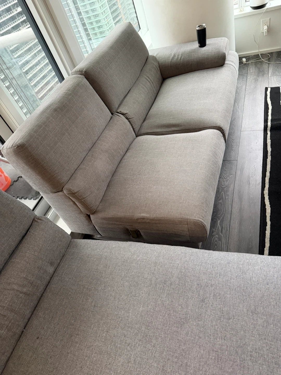 Comfortable light grey fabric sectional sofa. It features adjustable headrests for customized support. This sofa offers ample seating space for a living room. The pieces can be detached for easy movability