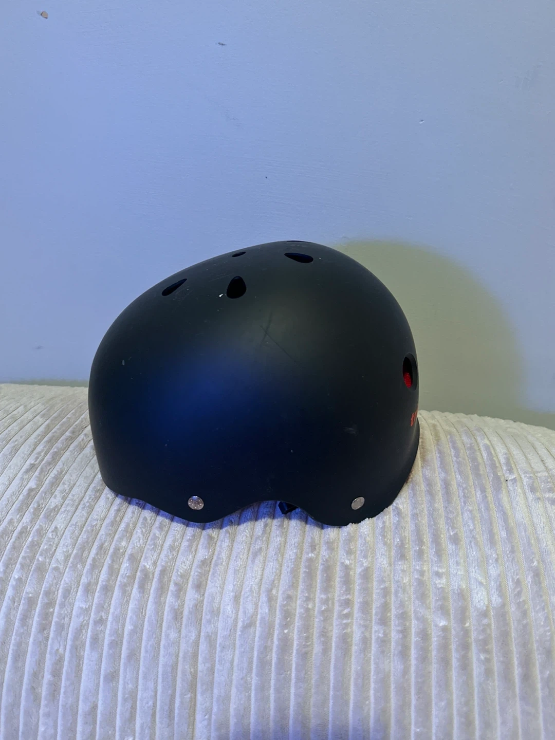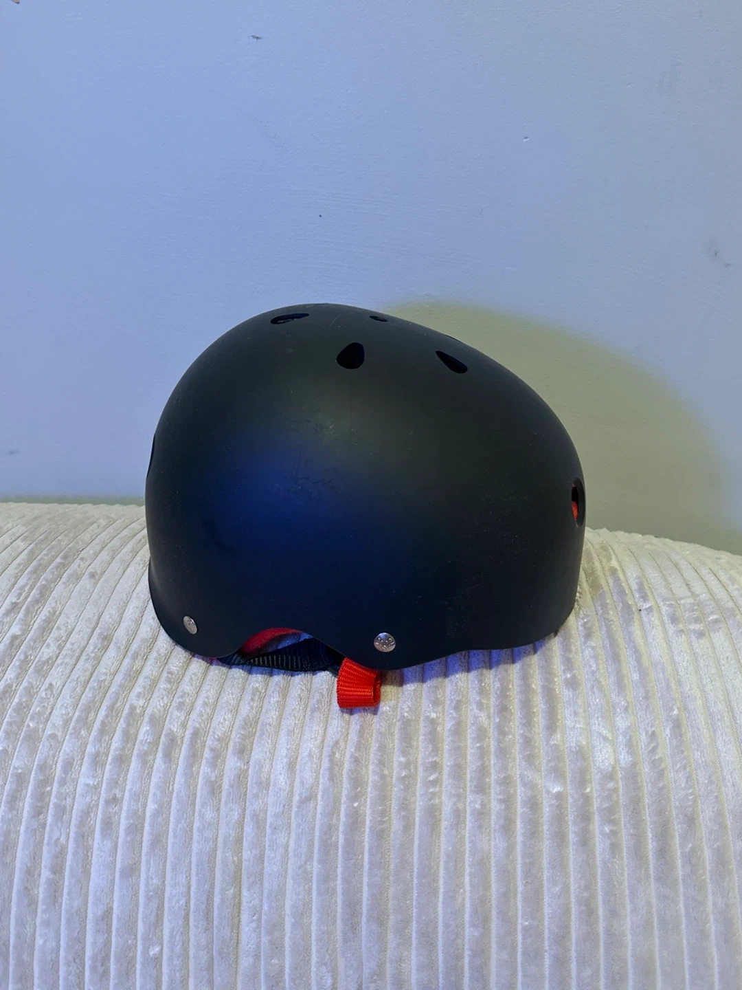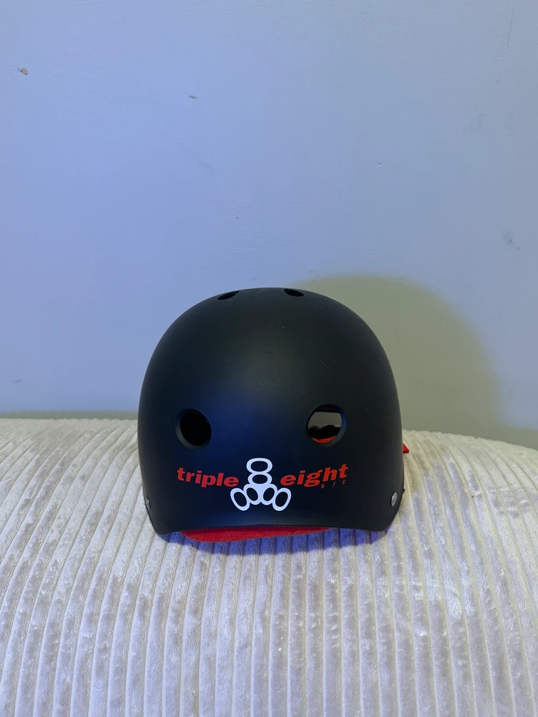 This is a black Triple 8 skate helmet. It's designed for safety during activities like skateboarding or cycling. Ventilation holes help keep you cool. It's a solid choice for head protection!