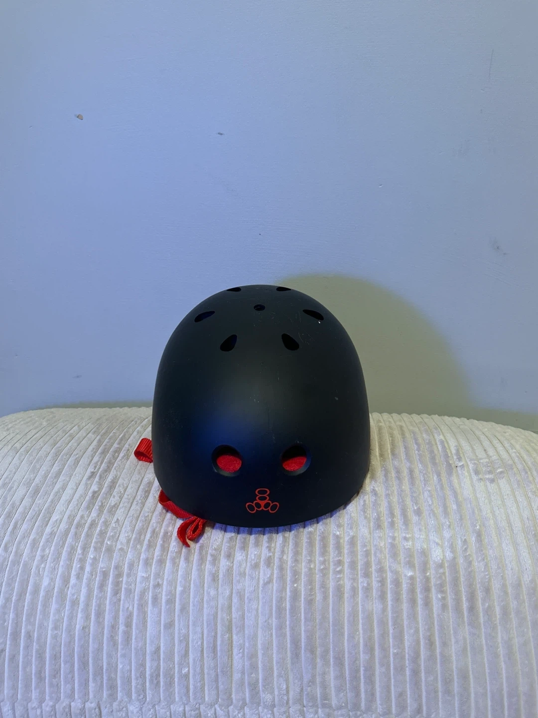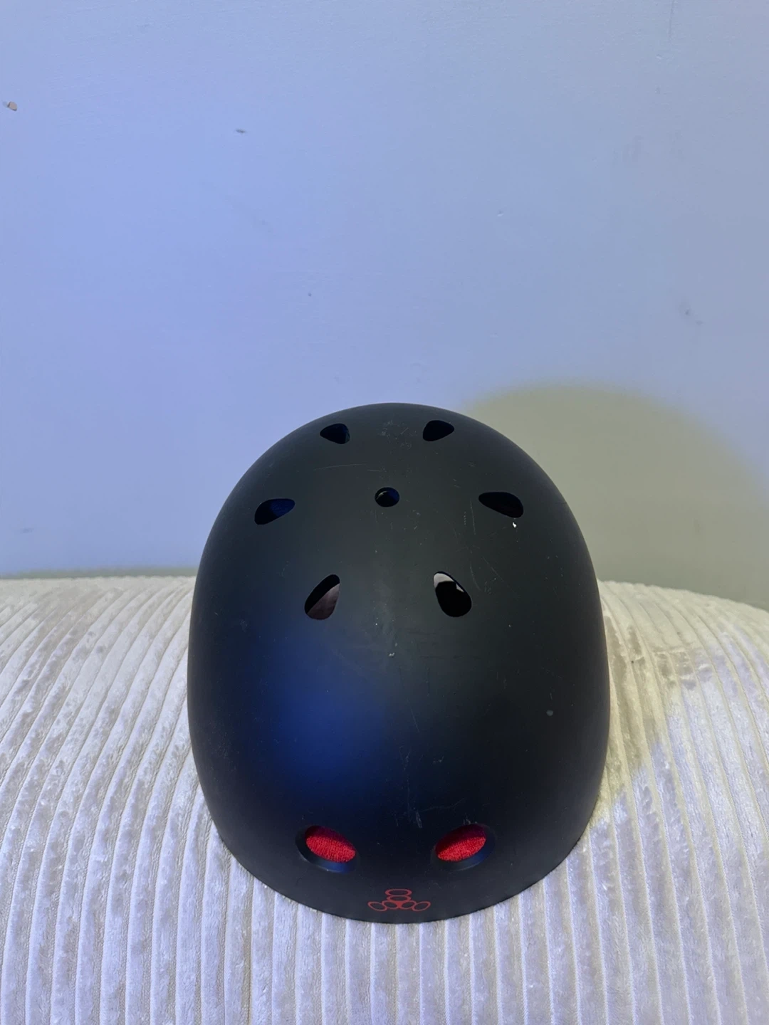 This is a black Triple 8 skate helmet. It's designed for safety during activities like skateboarding or cycling. Ventilation holes help keep you cool. It's a solid choice for head protection!