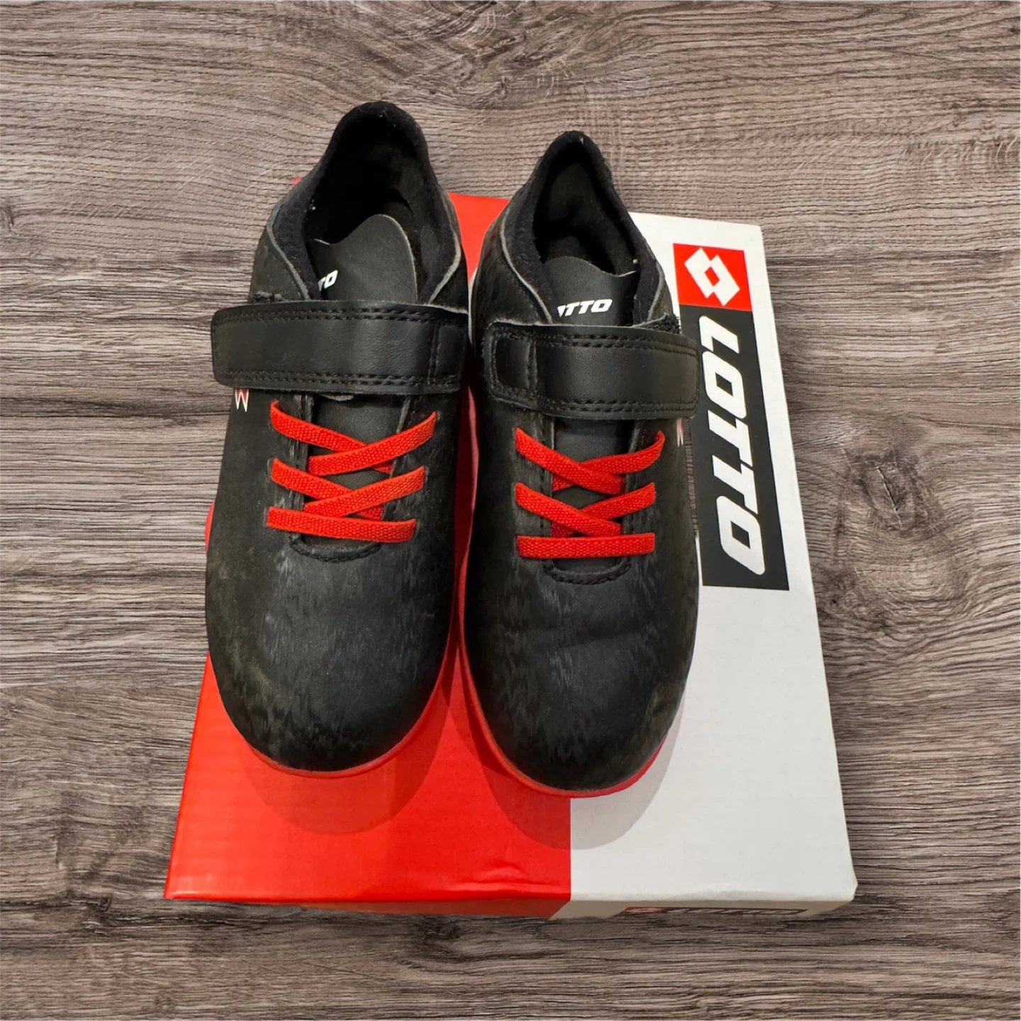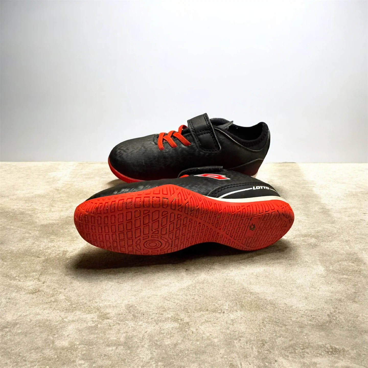 Lotto black and red soccer cleats for kids. These shoes feature velcro straps and laces for a secure fit. The outsoles are designed for traction on the field.
