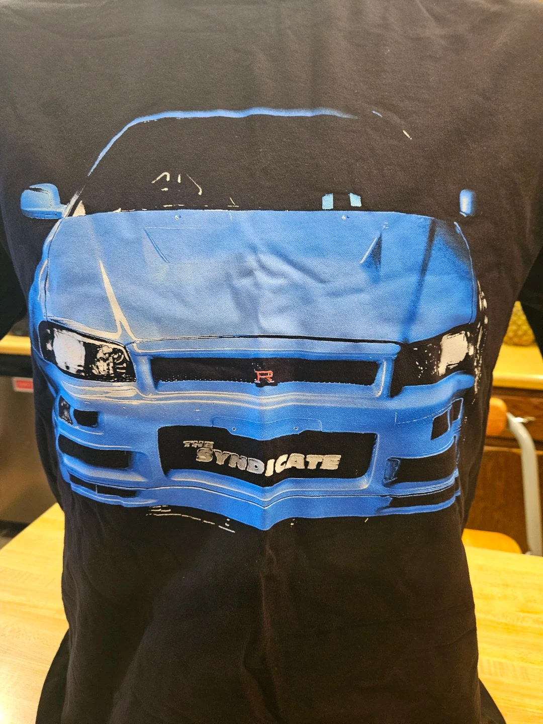 This is a black t-shirt with "The Syndicate" graphics featuring a stylized Nissan Skyline GT-R R34. The front of the shirt shows the car's front end, and the back shows the side profile with Paul Walker leaning against it. Fast and Furious.100% cotton material.