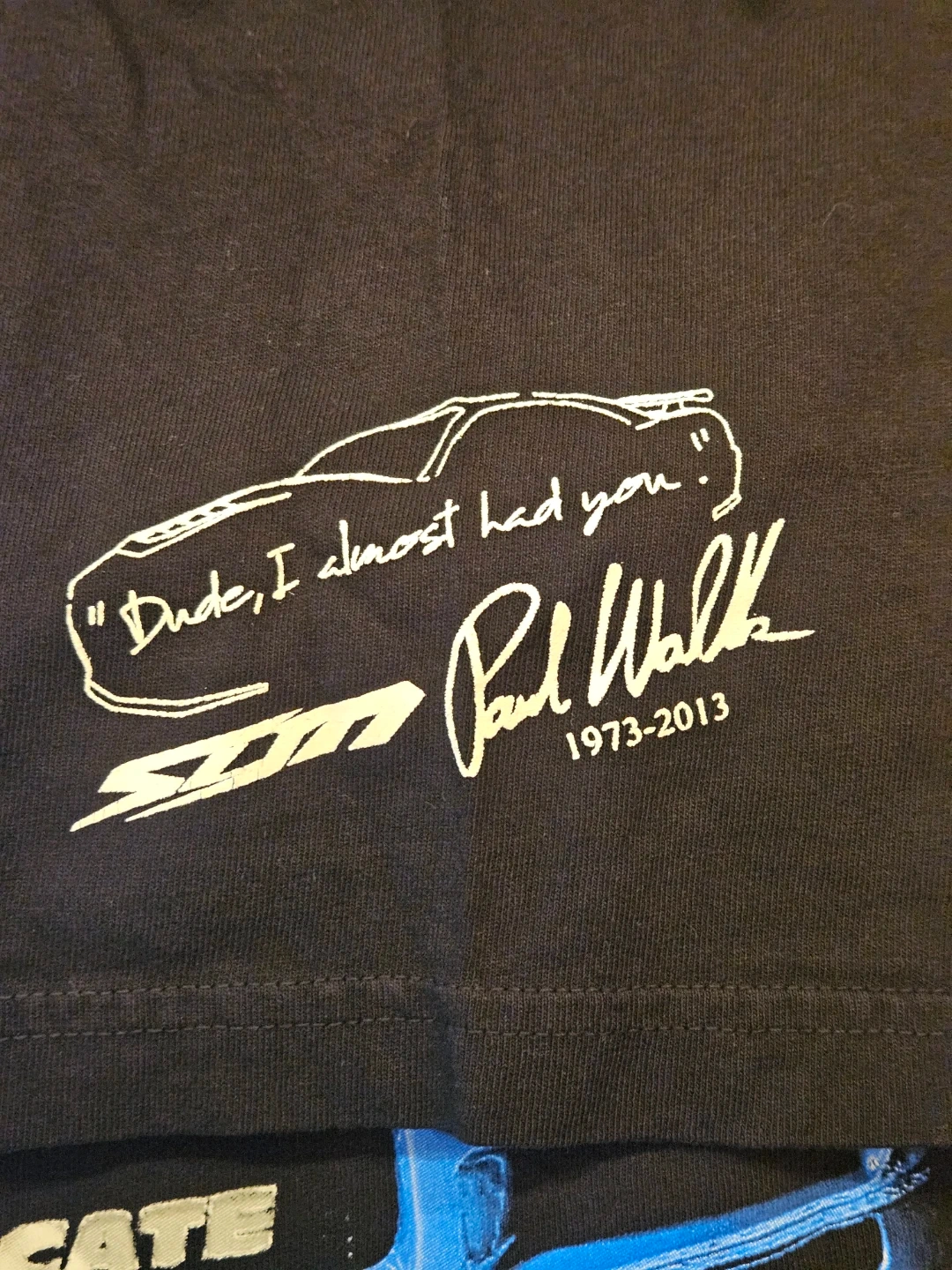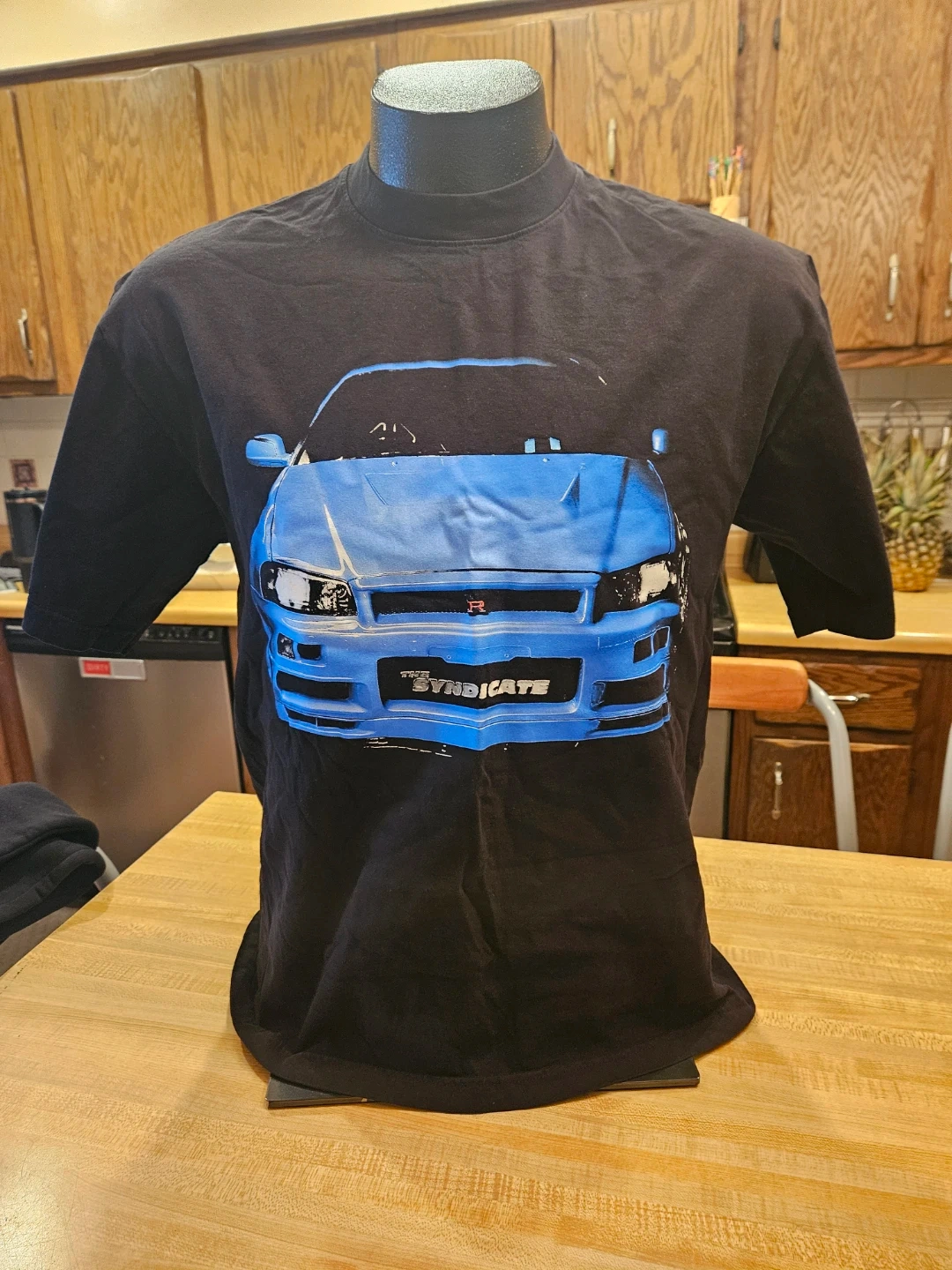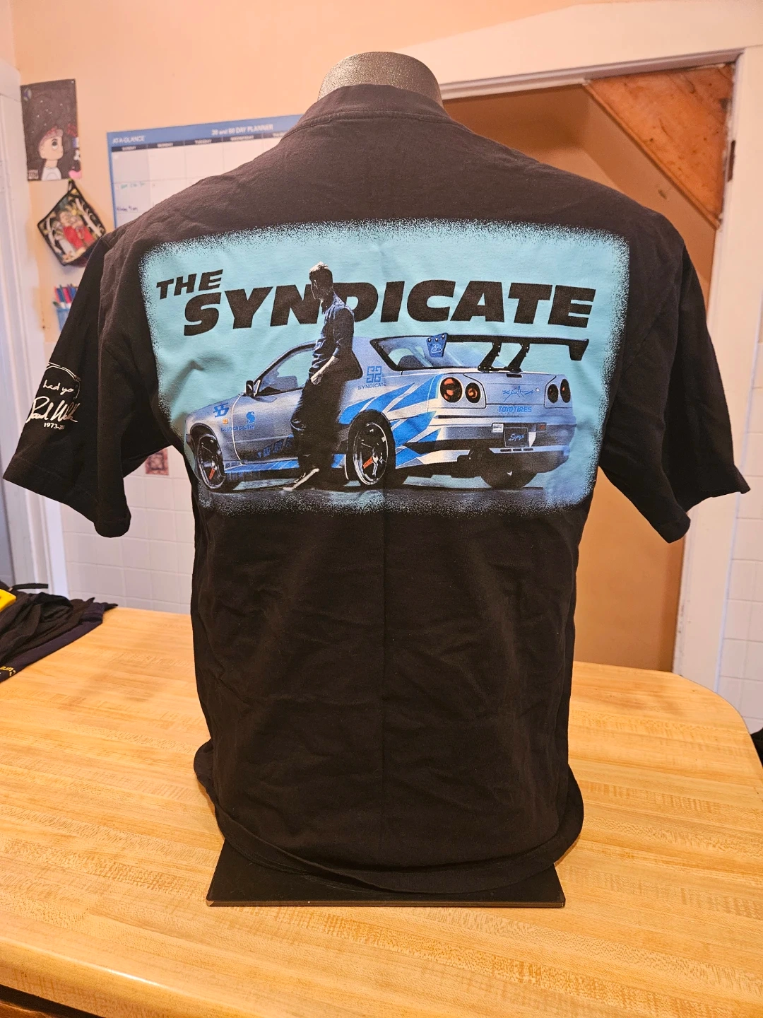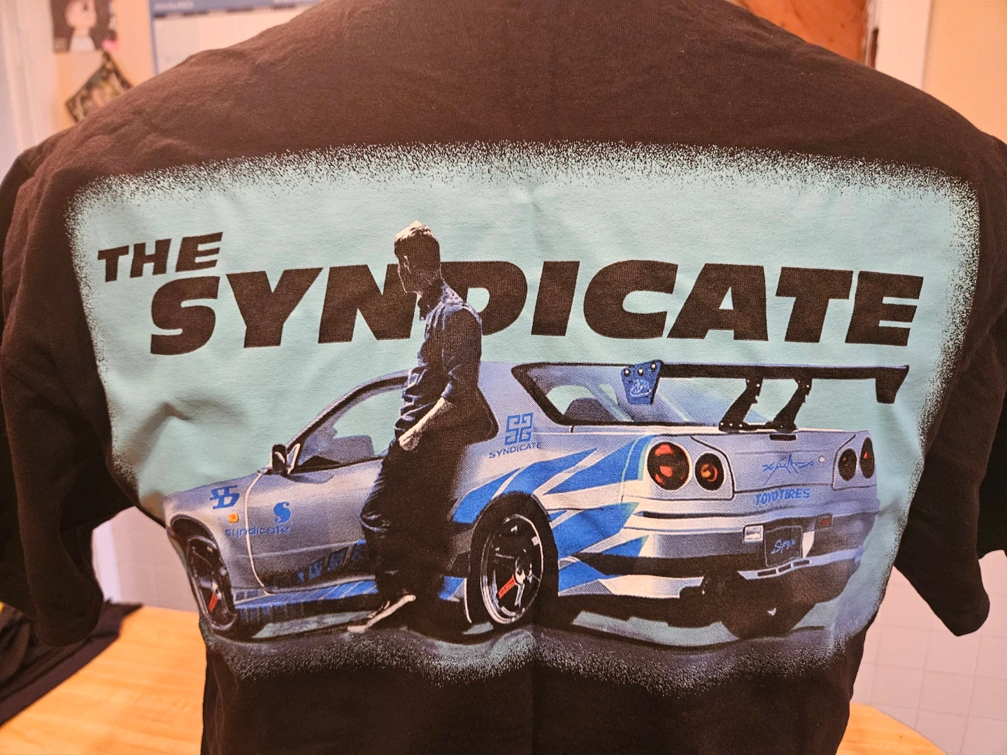 This is a black t-shirt with "The Syndicate" graphics featuring a stylized Nissan Skyline GT-R R34. The front of the shirt shows the car's front end, and the back shows the side profile with Paul Walker leaning against it. Fast and Furious.100% cotton material.