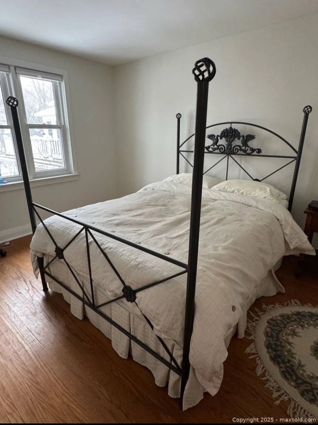 Fabulous metal headboard with two birds flanking a basket of fruit. Includes bed frame, headboard and footboard. Measures 60 in wide x 83 in deep x 63 in tall. Good pre owned condition overall with some scratches to frame mostly on legs. Frame only.