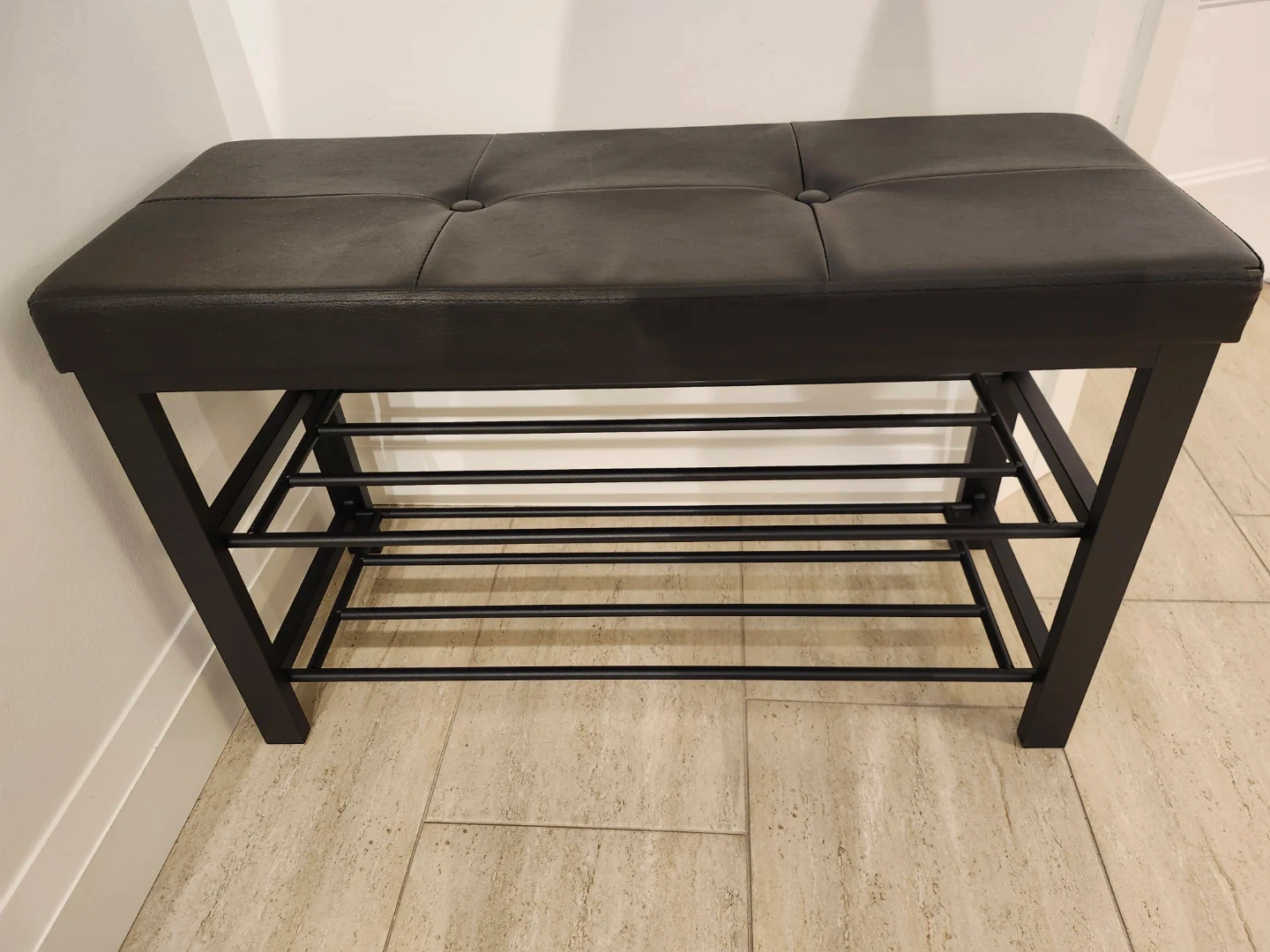 This bench offers a comfortable tufted faux leather seat and a two-tier metal shoe rack underneath. It's great for entryway organization or at the foot of a bed. Black faux leather upholstery. Metal frame.