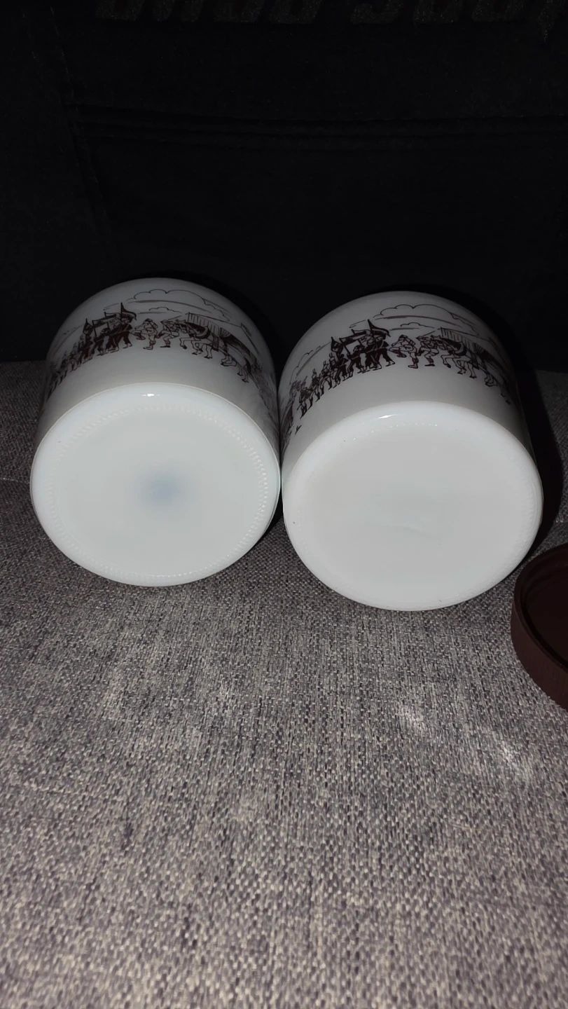 Here's a set of two Vintage Honey jars made in white milk glass, each featuring a charming brown circus-themed design. They come with dark brown screw-on lids. These jars are great for storing small items or for decorative display.