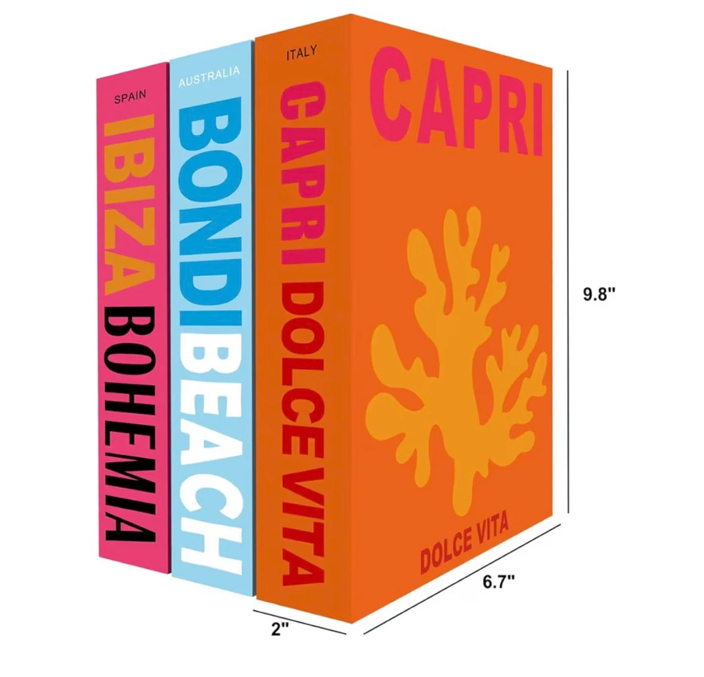 Set of three decorative storage books by Anerzza. Includes 'Bondi Beach', 'Ibiza Bohemia', and 'Capri Dolce Vita'. These faux books offer a stylish way to store small items!