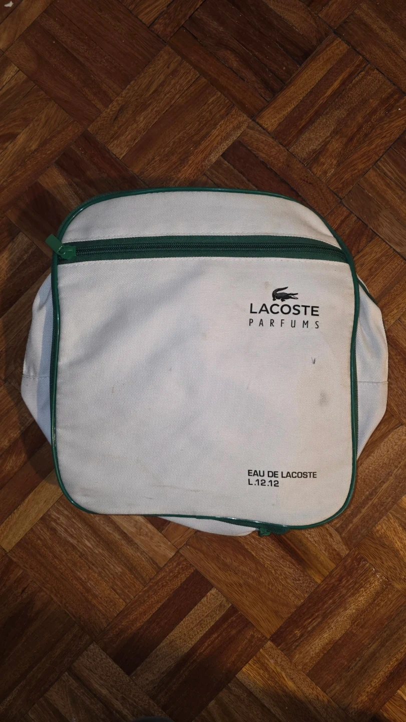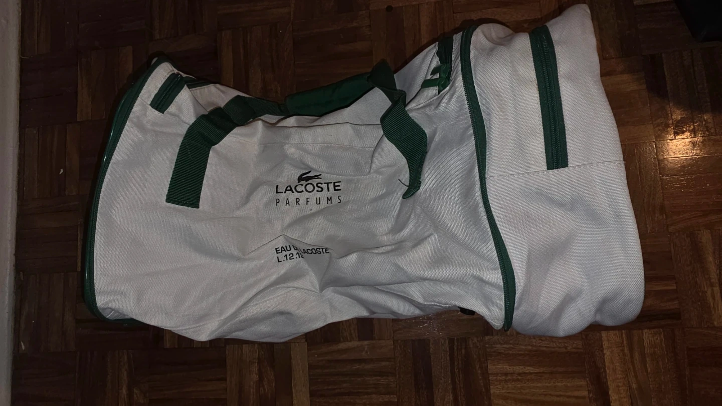 This is a white duffle bag from Lacoste Parfums, featuring the Eau de Lacoste branding. It has green trim and handles. Multiple zippered compartments for storage.