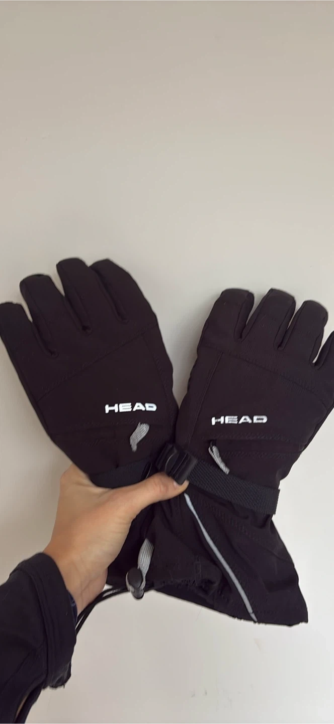 These black winter gloves are from HEAD. They have adjustable wrist straps and drawstrings for a snug fit. They're perfect for keeping your hands warm in colder weather!